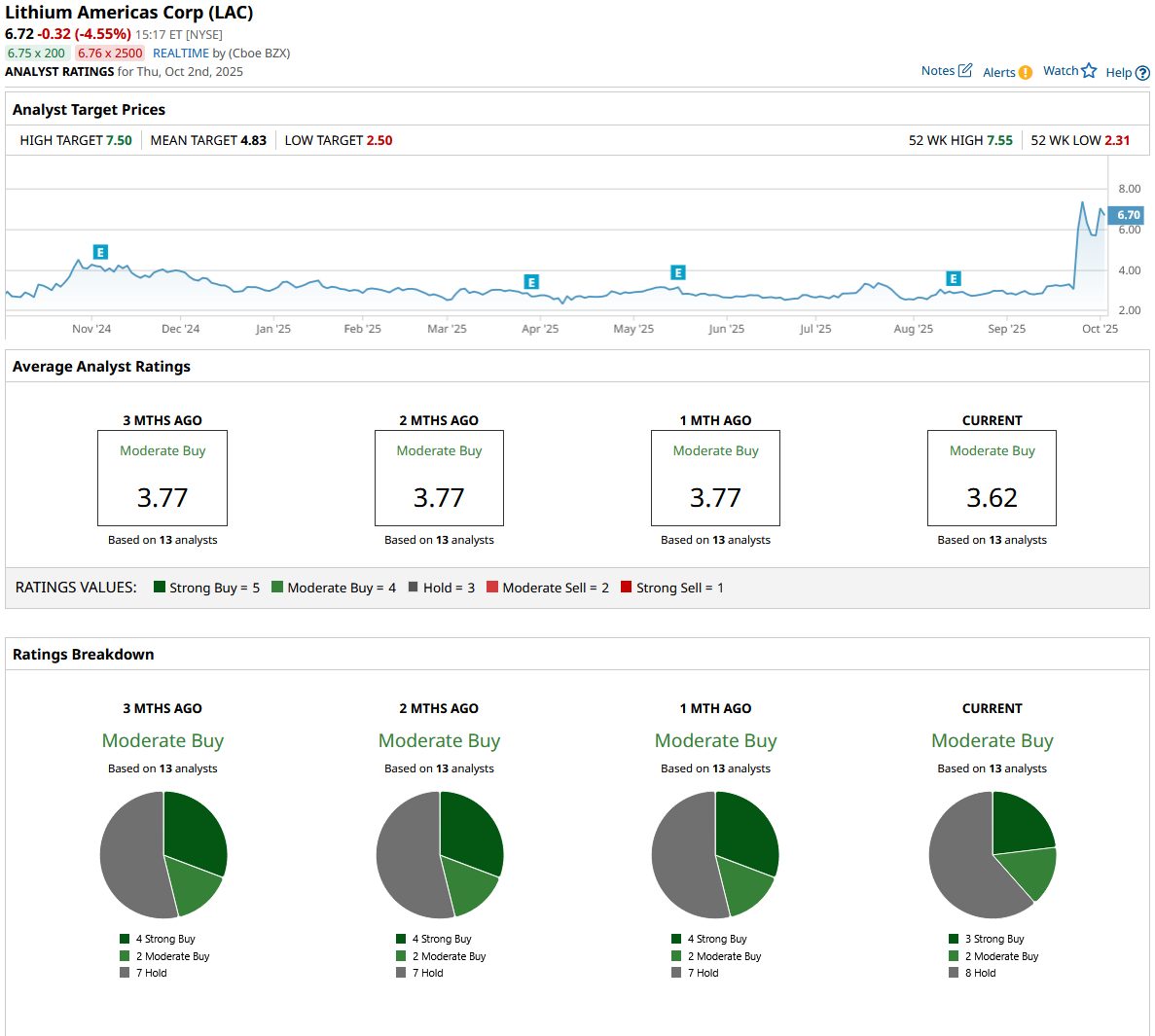 Analysts hold a consensus “Moderate Buy” rating overall on the stock. Of the 13 analysts rating LAC stock, three gave a “Strong Buy” rating, two a “Moderate Buy” rating, and eight a “Hold” rating. The consensus price target of $4.83 represents a 28% downside from current levels. However, the Street-high price target of $7.50 means a 12% upside from current levels.