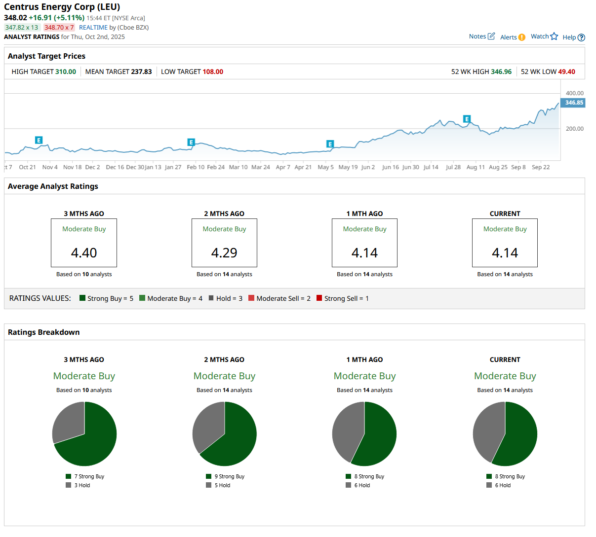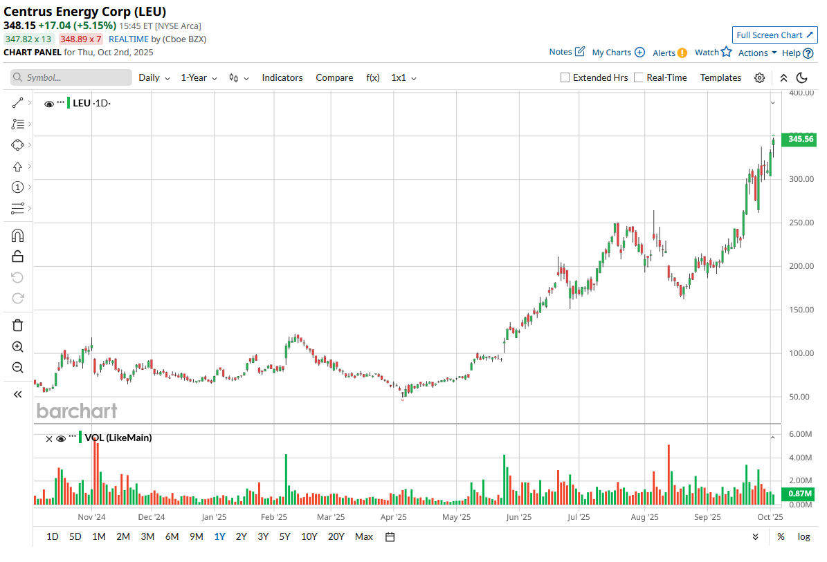 Prices are speaking for themselves. From roughly $63.50 per pound in early 2025, uranium has surged north of $80 this month. LEU shares mirror the momentum, touching a fresh 52-week high today of $346.96 with a 13.1% intraday climb on Sept. 25 due to Centrus' expansion news.