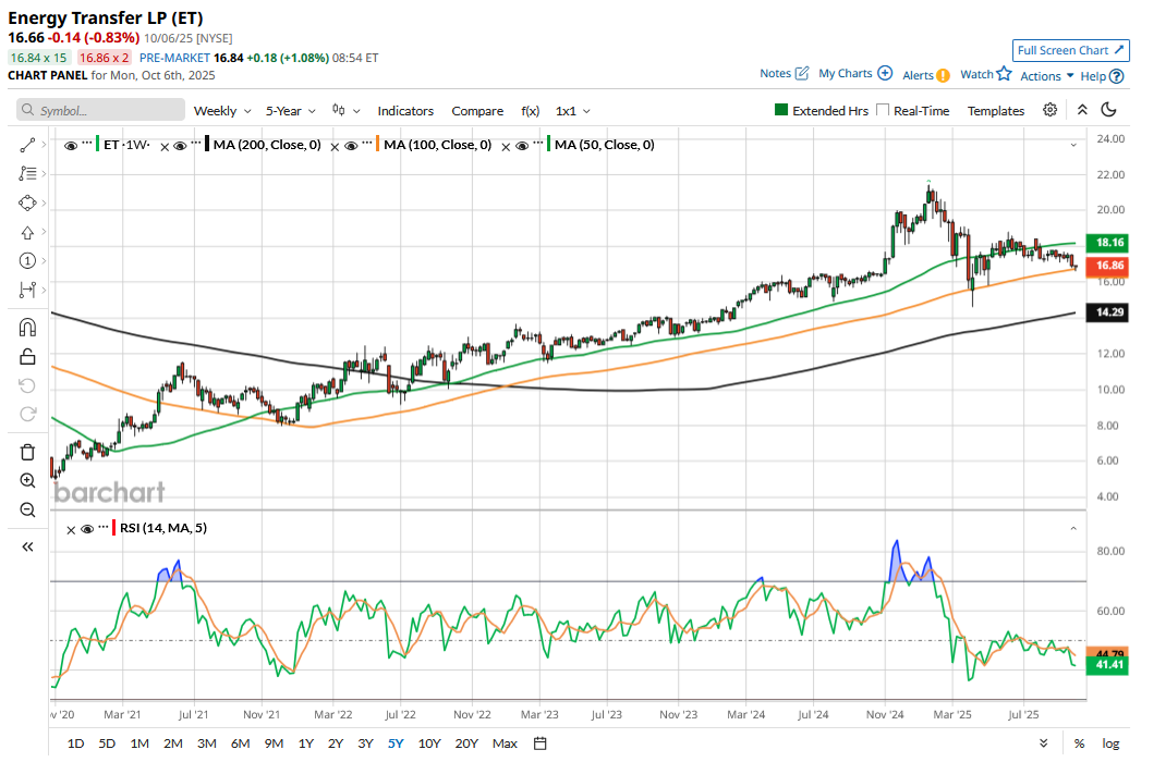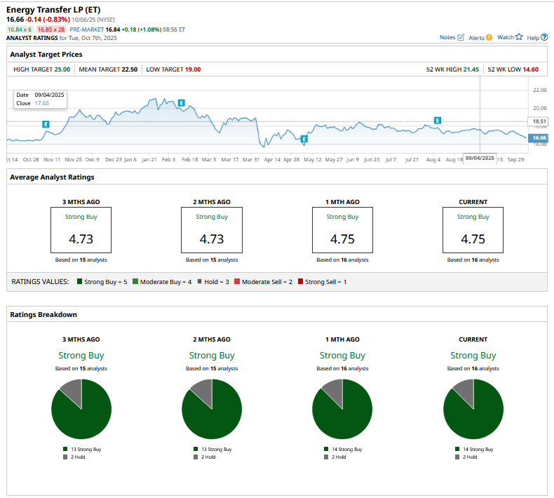 Earlier this month, Wells Fargo analyst Michael Blum added ET stock to his “tactical ideas” list for the final quarter of this year while maintaining an “Overweight” rating and $23 target price. Blum listed the final investment decision of Lake Charles, a possible announcement of a gas pipeline project with recently listed Fermi America (FRMI), which has signed a memorandum of understanding for pipeline capacity from Energy Transfer, and the expected expansion of the Desert SW pipeline to 3 Bcf/d as the triggers that can take ET stock higher in Q4.