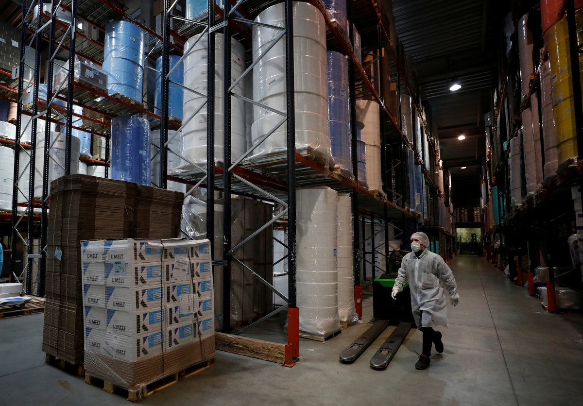 An employee works in the warehouse at the Kolmi-Hopen company's factory in Saint-Barthelemy-d'Anjou as their activities boosted following the coronavirus outbreak, France, February 5, 2020. Picture taken February 5, 2020. REUTERS/Stephane Mahe