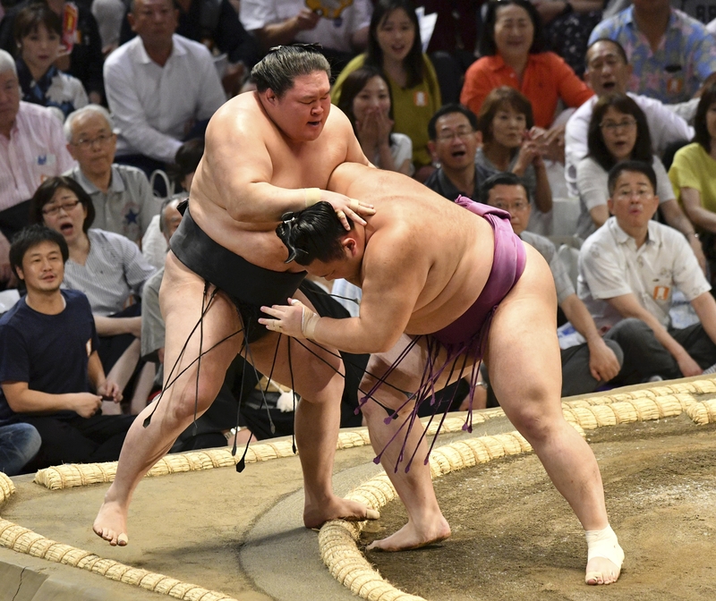 Asanoyama, who won his first Emperor's Cup in May, defeated ozeki Goeido to start off strong. He overwhelmed the ozeki, who battled along the edge to stay alive before Asanoyama forced him out.