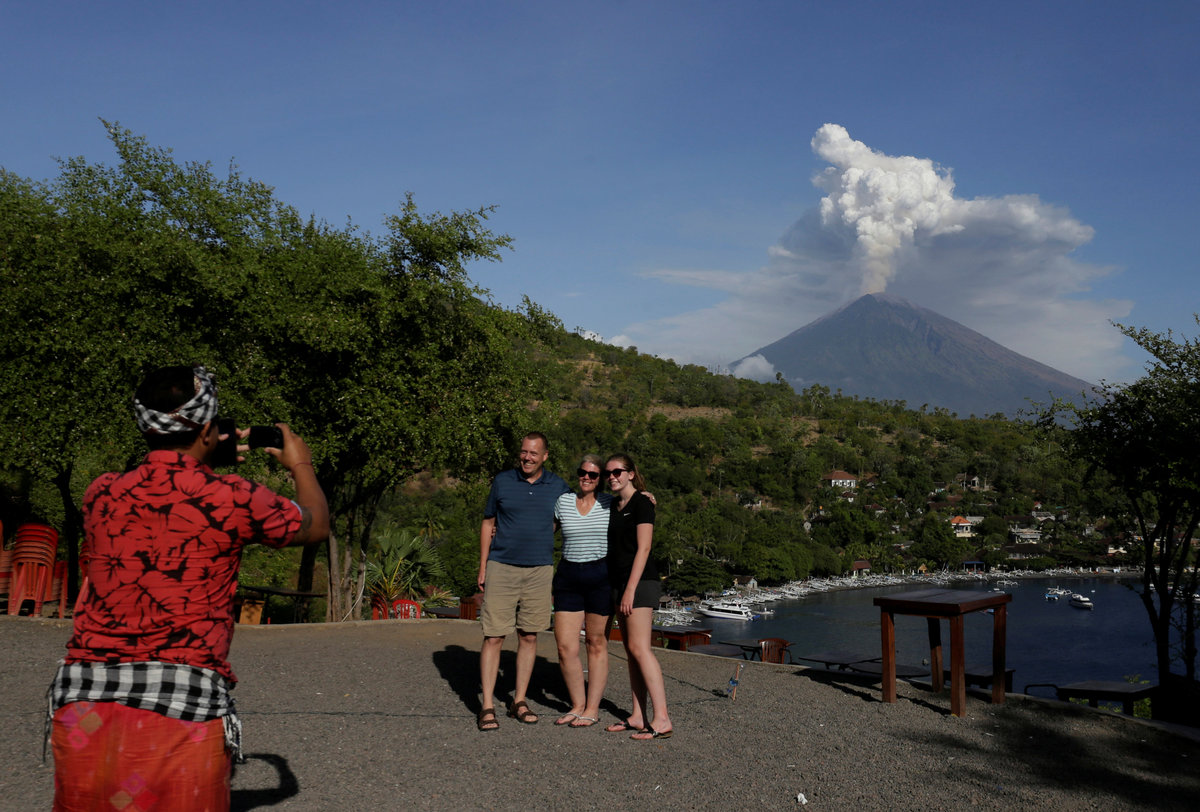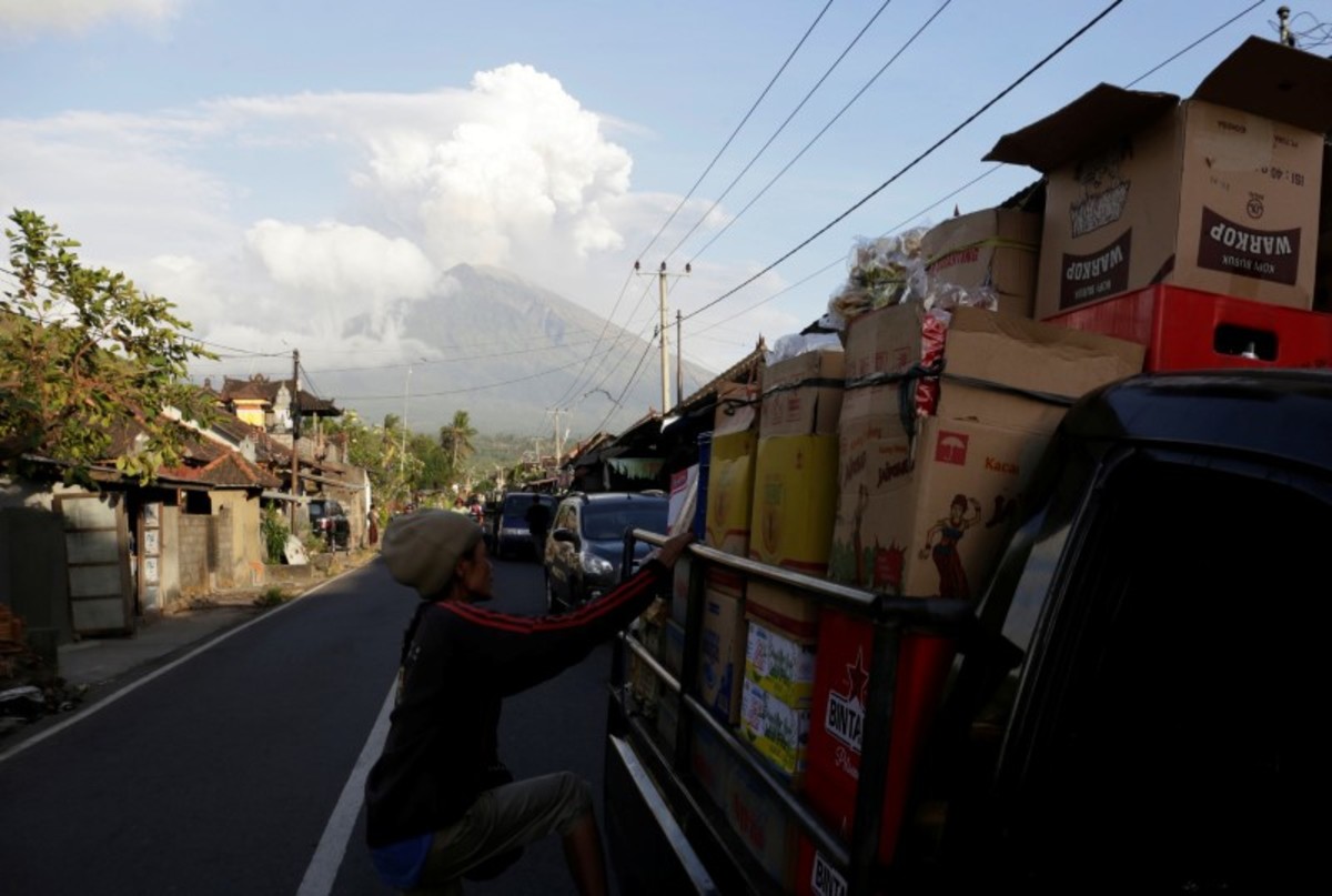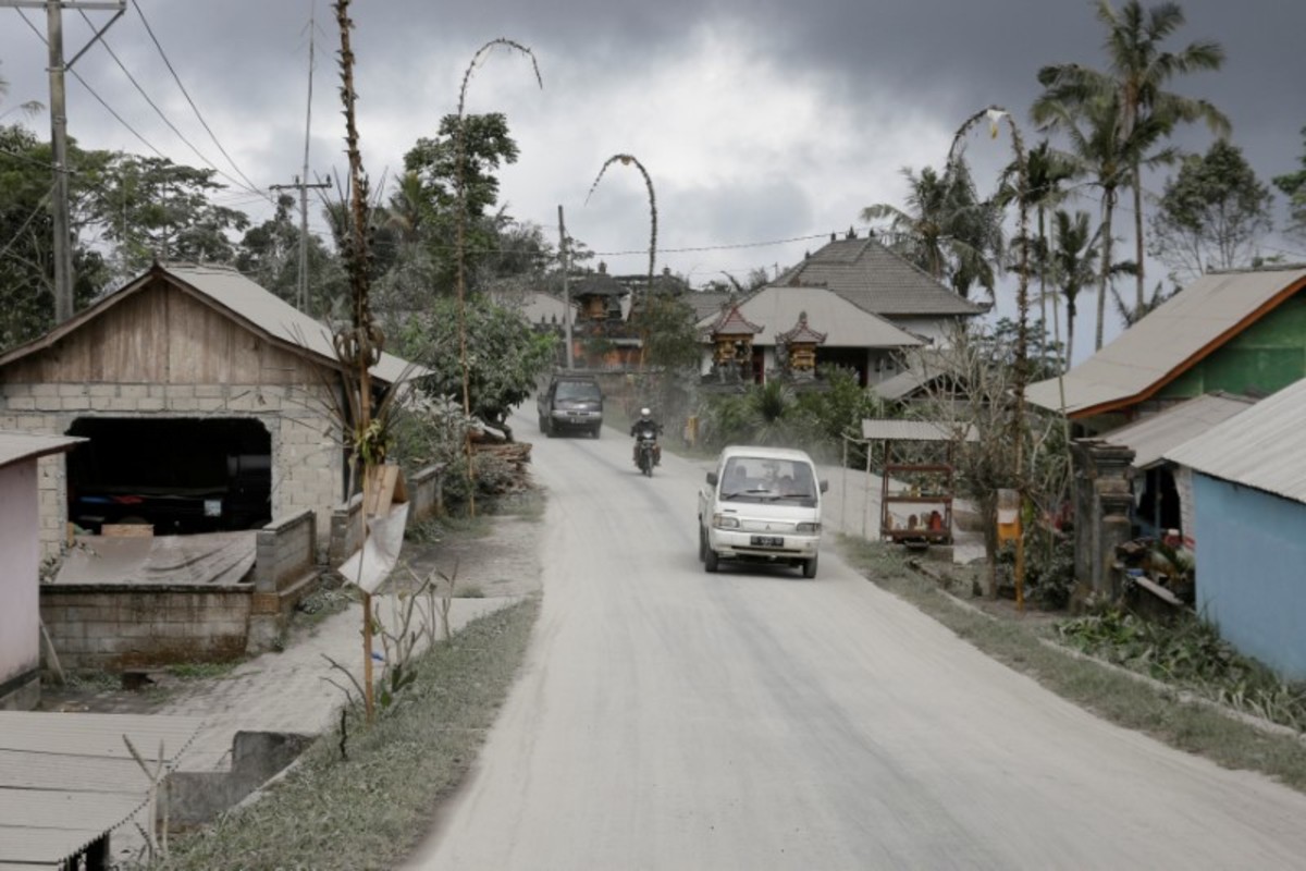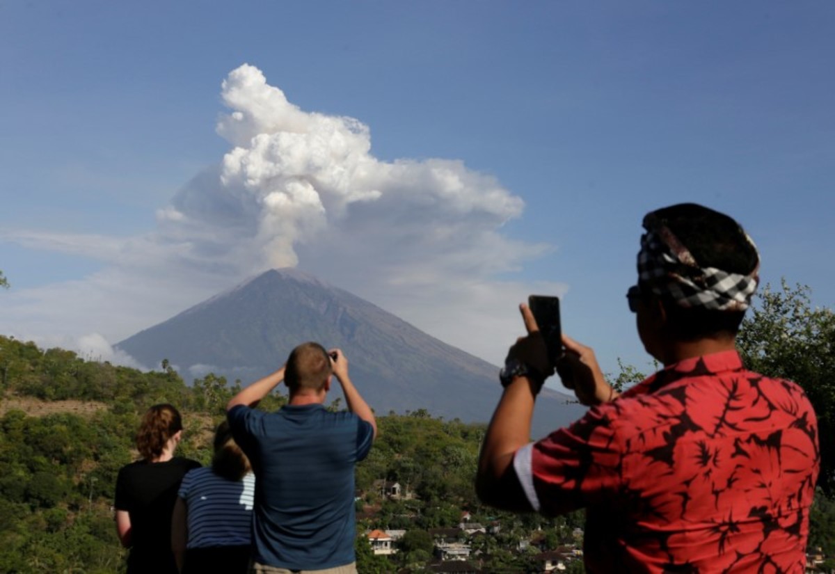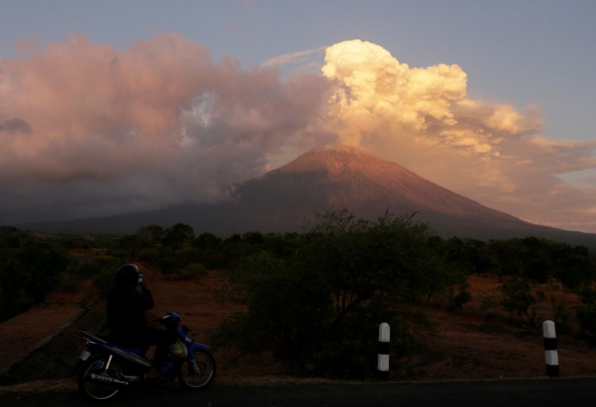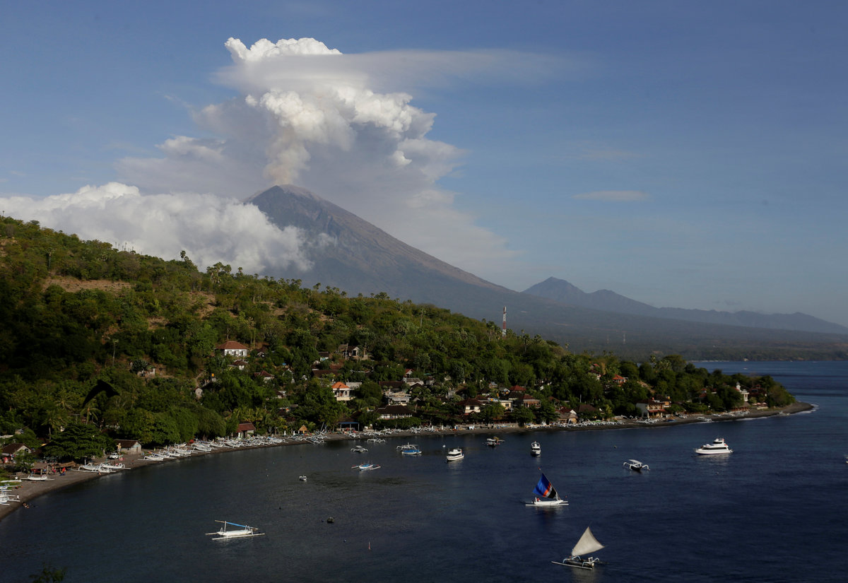 Mount Agung volcano can be seen erupting from Amed in Karangasem Regency, Bali, Indonesia June 29, 2018. REUTERS/Johannes P. ChristoA motorist takes pictures of Mount Agung volcano erupting in Kubu, Karangasem Regency in Bali, Indonesia on June 29, 2018. REUTERS/Johannes P. ChristoMount Agung volcano erupts, as seen from Kubu, Karangasem Regency in Bali, Indonesia on June 29, 2018. REUTERS/Johannes P. ChristoMount Agung volcano erupts, as seen from Kubu, Karangasem Regency in Bali, Indonesia on June 29, 2018. REUTERS/Johannes P. ChristoMotorists use mask as they ride through street covered by volcanic ash from the eruption of Mount Agung volcanic at Pemuteran village in Karangasem Regency, Bali resort island, Indonesia, June 29, 2018. REUTERS/Johannes P. ChristoVehicles travel through street covered by volcanic ash from the eruption of Mount Agung volcanic at Pemuteran village in Karangasem Regency, Bali resort island, Indonesia, June 29, 2018. REUTERS/Johannes P. ChristoA dog crosses a street covered by volcanic ash from the eruption of Mount Agung volcanic at Pemuteran village in Karangasem Regency, Bali resort island, Indonesia, June 29, 2018. REUTERS/Johannes P. ChristoA villager uploads boxes of goods on a truck as Mount Agung volcano's eruption is seen in the background in Amed in Karangasem Regency, Bali resort island, Indonesia June 29, 2018. REUTERS/Johannes P. ChristoA guide take pictures of foreign tourists with Mount Agung volcano's eruption in the background, seen from Amed in Karangasem Regency, Bali resort island, Indonesia on June 29, 2018. REUTERS/Johannes P. Christo