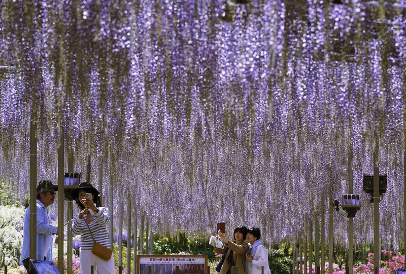Visitors wearing masks were seen Wednesday enjoying the purple fantasy of the 160,000 strands of flowers hanging from the massive wisteria trellises, spread out over an area of 2,000 square meters. This year marks the earliest that the wisteria are in full bloom since the park first opened in 1997.