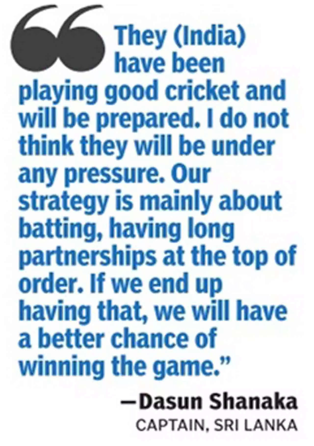 DUBAI: During an ultra-short pre-match press conference, Dasun Shanaka couldn't stop gushing about India's firepower. The Sri Lankan captain had earlier in the Asia Cup got into trash talk in the lead-up to a virtual knockout game against Bangladesh. As India find themselves in an equally vulnerable position for Tuesday's match, Shanaka stayed away from daring his opponents this time.