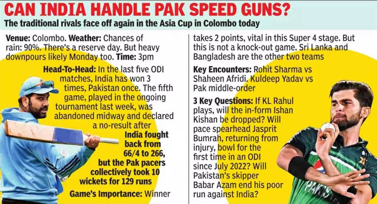 After numerous statements by current and former board chiefs and players, a plethora of social media posts, sarcasm-dipped icy barbs about floodlight failure in Lahore and tireless discussion over rainy Colombo as a choice of venue for a marquee event like the Asia Cup, the focus will finally shift to cricket as India take on Pakistan in the Super Four clash of the tournament at the Sri Lankan capital's throbbing cricketing epicentre, the R Premadasa Stadium on Sunday.