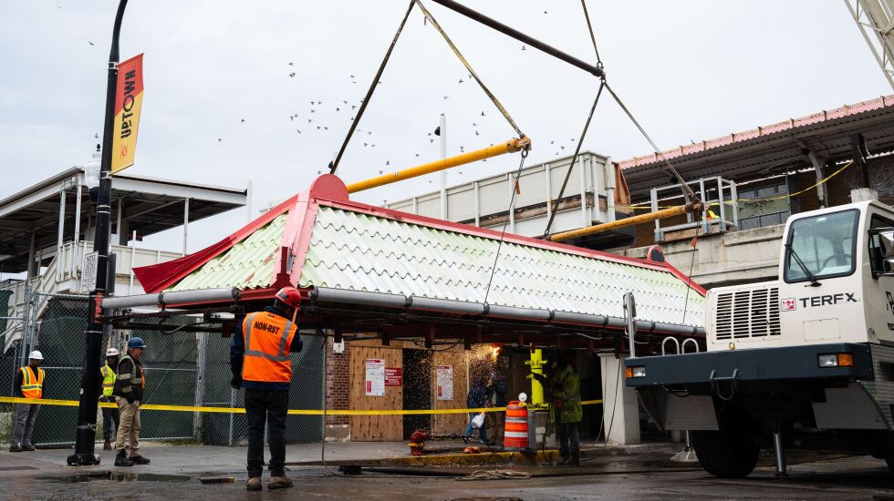 Crews removed the pagoda and sign in the Uptown neighborhood on Tuesday. The pieces will be stored until a new location is determined, according to the Chicago Transit Authority.