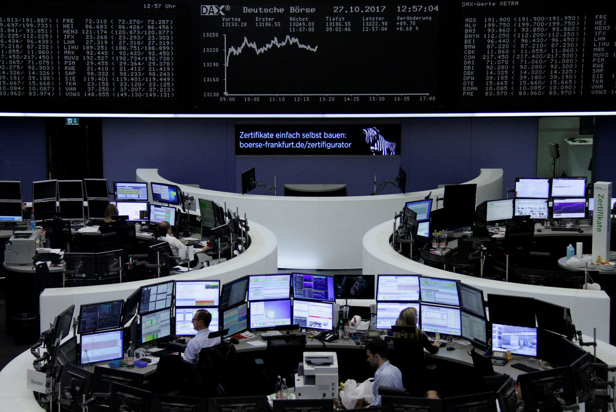 NEW YORK (Reuters) - A gauge of global equities hit an intraday record on Monday as a bounce in Spain helped lift European stocks, while Wall Street declined following a technology-led rally last week and a report that the U.S. House of Representatives was discussing a gradual tax cut.