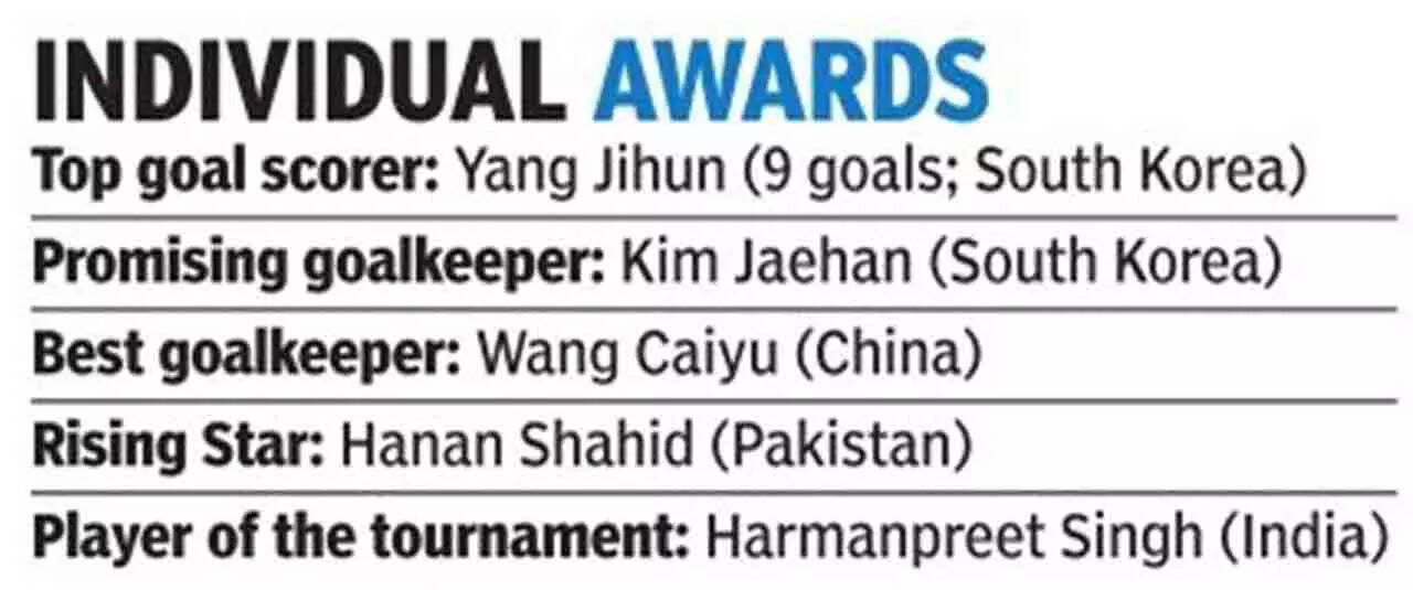 And yet it was the effervescence of skipper Harmanpreet Singh that set up the winner. Harmanpreet, deservingly named player of the tournament, whizzed past a battery of Chinese defenders on the left and the overload ensured space for Jugraj, whose clean collection near the post translated into a goal.