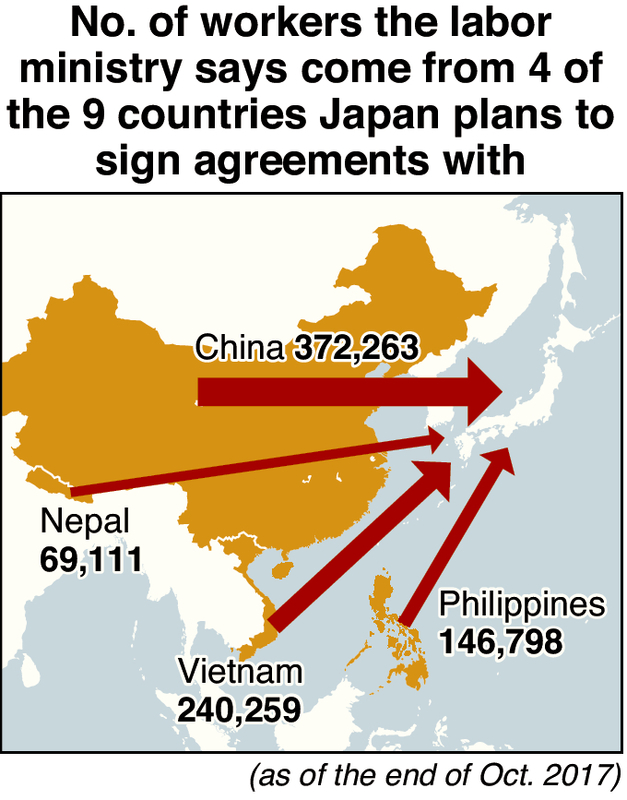 The combined number of workers staying in Japan from eight of the nine nations in Asia, excluding Mongolia, stands at about 900,000, making up around 70 percent of all foreign workers in Japan. With the introduction of the new system, the figure from those countries is expected to increase further.
