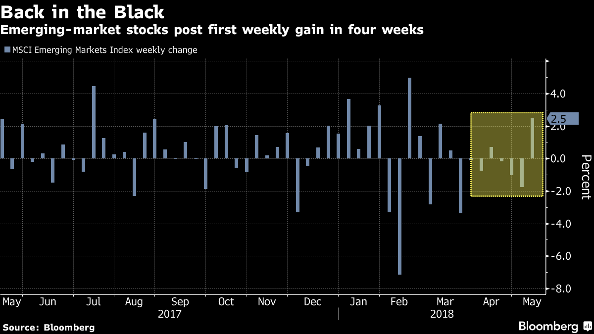 Trump’s shock move on China’s ZTE provided a sign that he may be open to easing trade tensions ahead of a meeting in Washington with Chinese officials this week. A slew of Federal Reserve officials speak in the five days, with investors looking for clues on the pace of monetary tightening. In Europe, political pressures remain high as Italian populists near completion of a government plan, Britain faces a crunch week over Brexit, and the U.S. formally moves its embassy to Jerusalem.