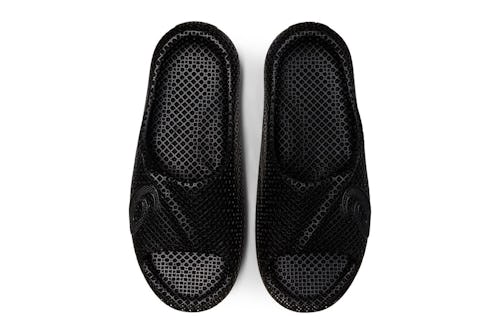 The highlight of the Actibreeze 3D, however, is hidden inside its footbed, which houses a diamond-shaped matrix. Like those of Birkenstocks, the insole is meant to slowly adapt to individual foot contours, offering personalized comfort and support. Underfoot, the slide’s sole continues this feeling with a hefty 3D-printed cushion that bounces back.