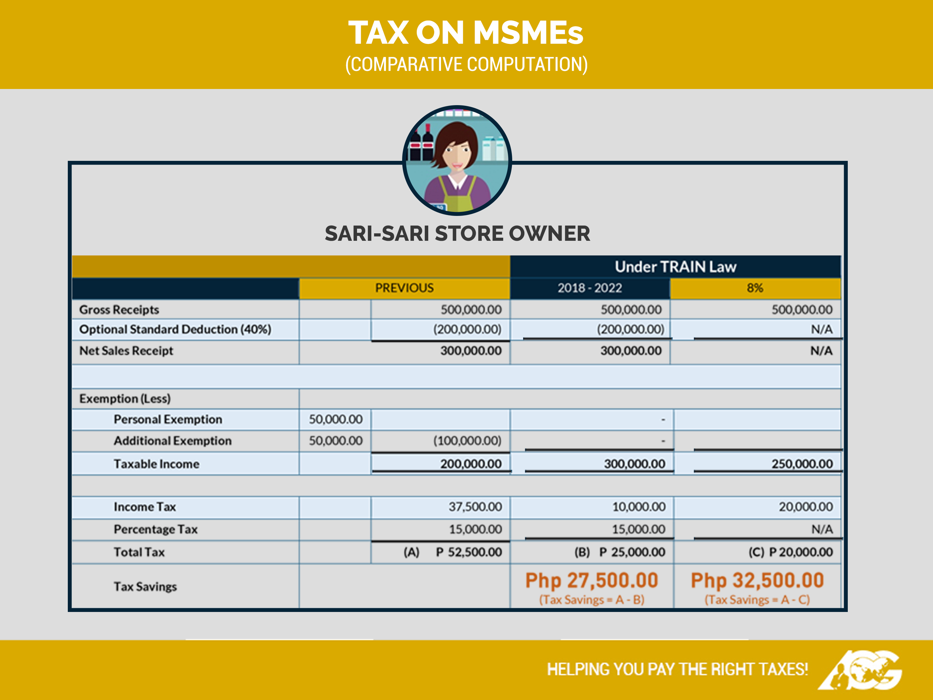 4. For microentrepreneurs like me (a sari-sari store owner) earning annual gross sales of P500,000, how much tax will I pay? Will there be any tax savings or benefit from the TRAIN law?