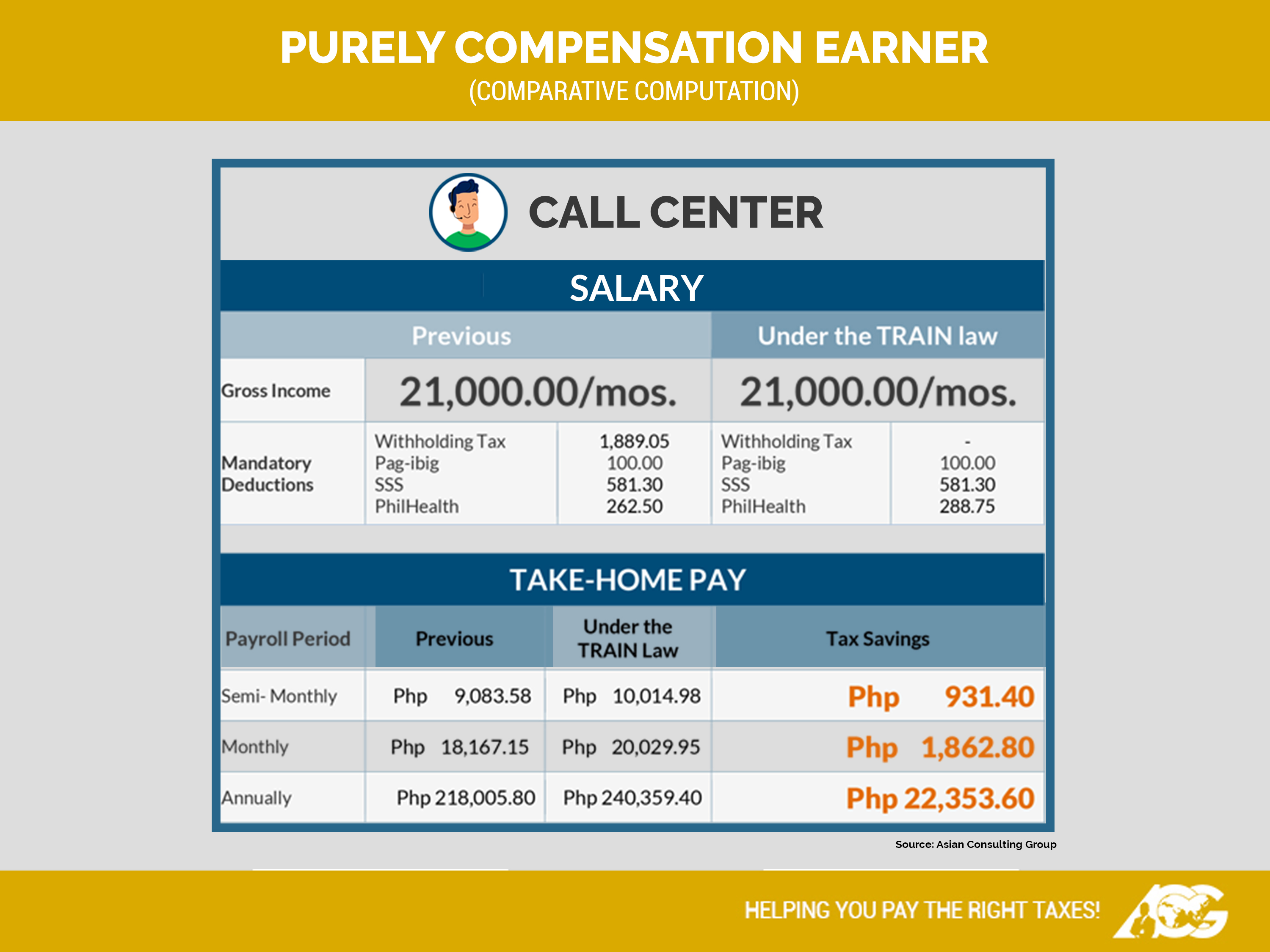 3. For an ordinary employee like me (a call center agent) earning a monthly salary of P21,000, what benefits can I expect from the TRAIN law? When would it be effective?