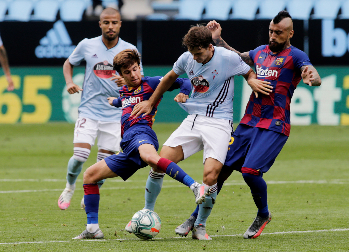 Soccer Football - La Liga Santander - Celta Vigo v FC Barcelona - Balaidos, Vigo, Spain - June 27, 2020 Celta Vigo's Denis Suarez in action with Barcelona's Riqui Puig, as play resumes behind closed doors following the outbreak of the coronavirus disease (COVID-19) REUTERS/Miguel VidalSoccer Football - La Liga Santander - Celta Vigo v FC Barcelona - Balaidos, Vigo, Spain - June 27, 2020 Barcelona's Ansu Fati in action with Celta Vigo's Joseph Aidoo, as play resumes behind closed doors following the outbreak of the coronavirus disease (COVID-19) REUTERS/Miguel Vidal