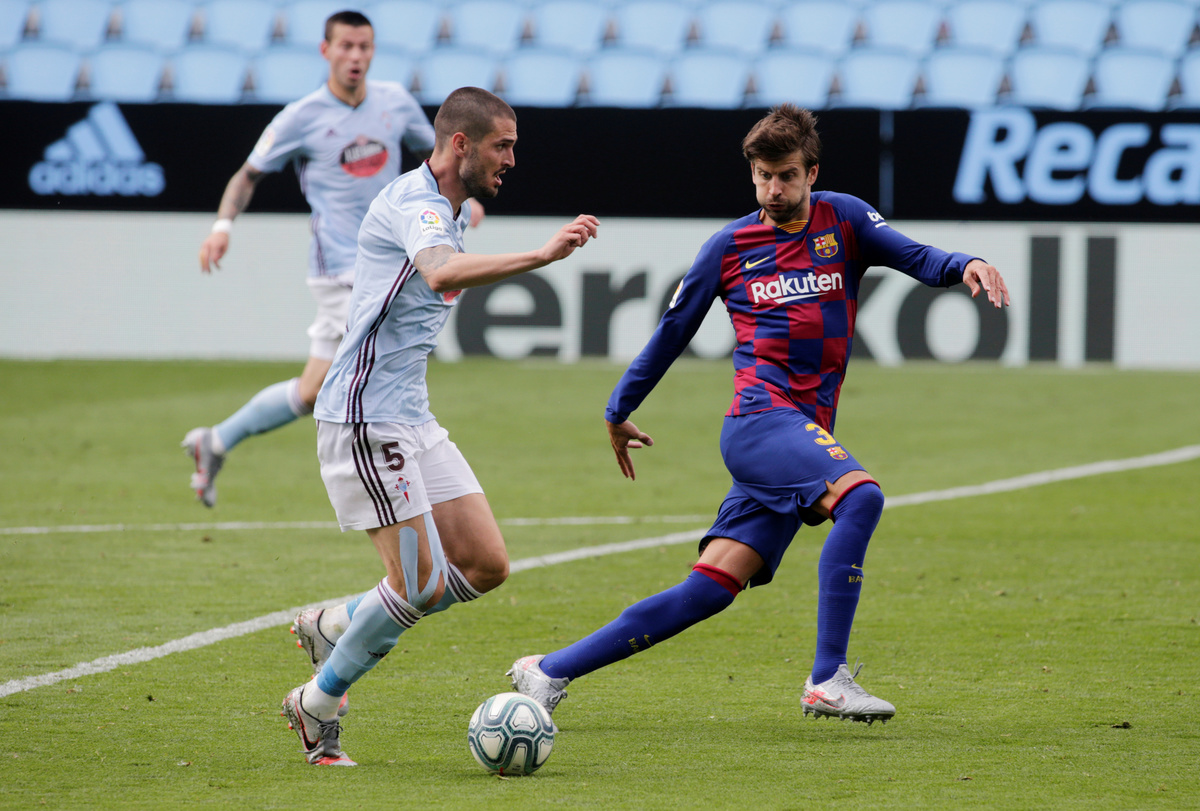 Soccer Football - La Liga Santander - Celta Vigo v FC Barcelona - Balaidos, Vigo, Spain - June 27, 2020 Celta Vigo's Iago Aspas in action with Barcelona's Gerard Pique, as play resumes behind closed doors following the outbreak of the coronavirus disease (COVID-19) REUTERS/Miguel Vidal