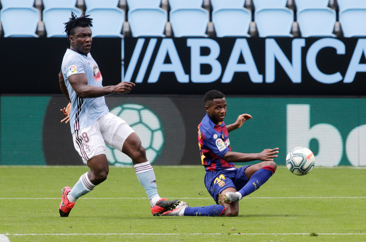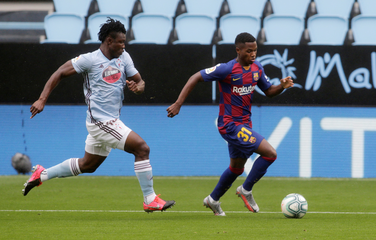 Soccer Football - La Liga Santander - Celta Vigo v FC Barcelona - Balaidos, Vigo, Spain - June 27, 2020 Celta Vigo's Joseph Aidoo in action with Barcelona's Ansu Fati, as play resumes behind closed doors following the outbreak of the coronavirus disease (COVID-19) REUTERS/Miguel Vidal