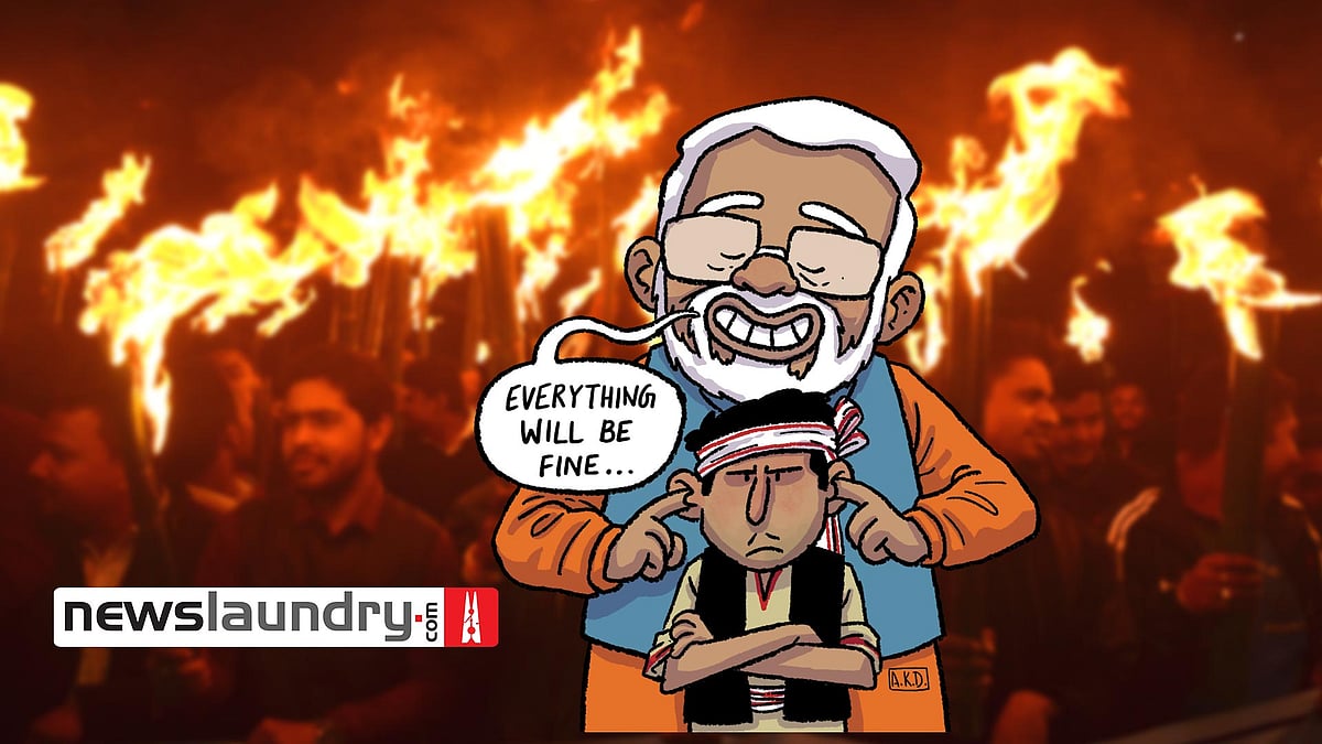 An illustration by Newslaundry Design Head Anish Daolagupu on the prevailing situation in Assam: