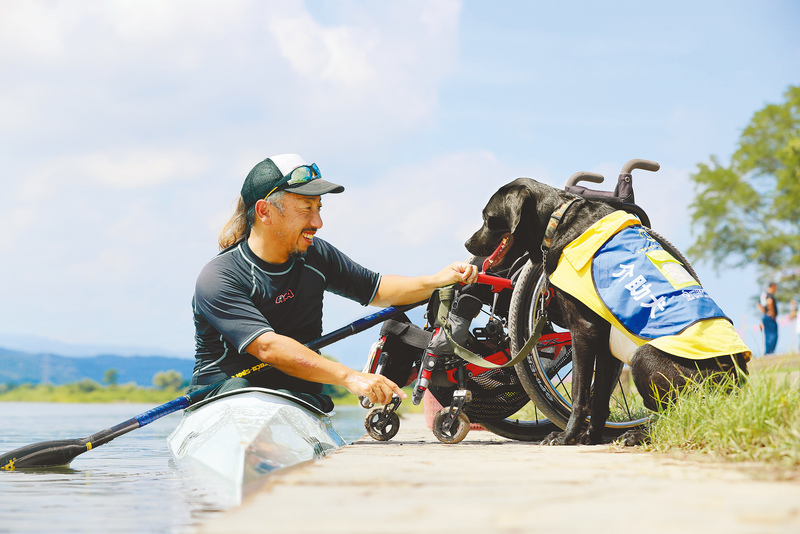 As Nobuyuki Wagatsuma pulled his canoe up to the bank of the Narusegawa river while training in Kami, Miyagi Prefecture, his service dog, Grape, who had been watching him paddle from the riverside, looked up at him.