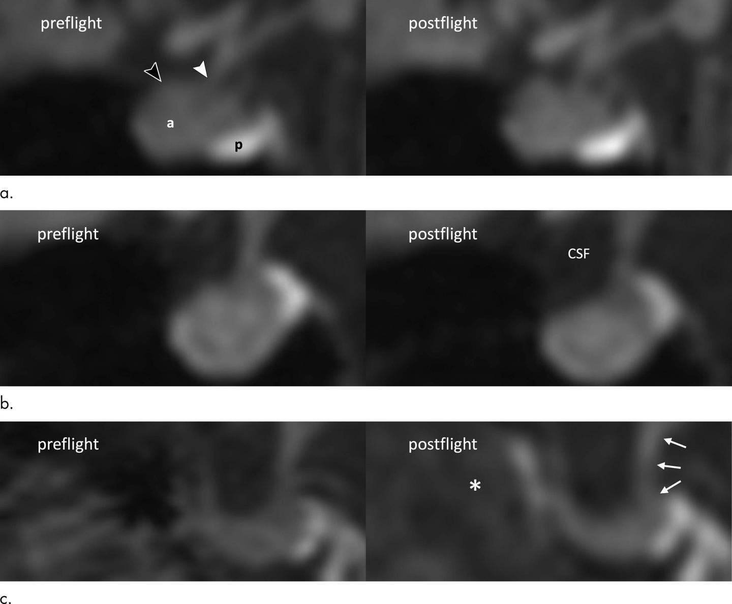 Eleven astronauts (mean age, 45 years ± 5 [standard deviation]; 10 men) showed increased mean volumes in the brain (28 mL; P < .001), white matter (26 mL; P < .001), mean lateral ventricles (2.2 mL; P < .001), and mean summated brain and CSF (33 mL; P < .001) at postflight day 1 with corresponding increases in mean aqueductal stroke volume (14.6 μL; P = .045) and mean CSF peak-to-peak velocity magnitude (2.2 cm/sec; P = .01). Summated mean brain and CSF volumes remained increased at 360 days after spaceflight (28 mL; P < .001). Qualitatively, six of 11 (55%) astronauts developed or showed exacerbated pituitary dome depression compared with baseline. Average midline pituitary height decreased from 5.9 to 5.3 mm (P < .001).