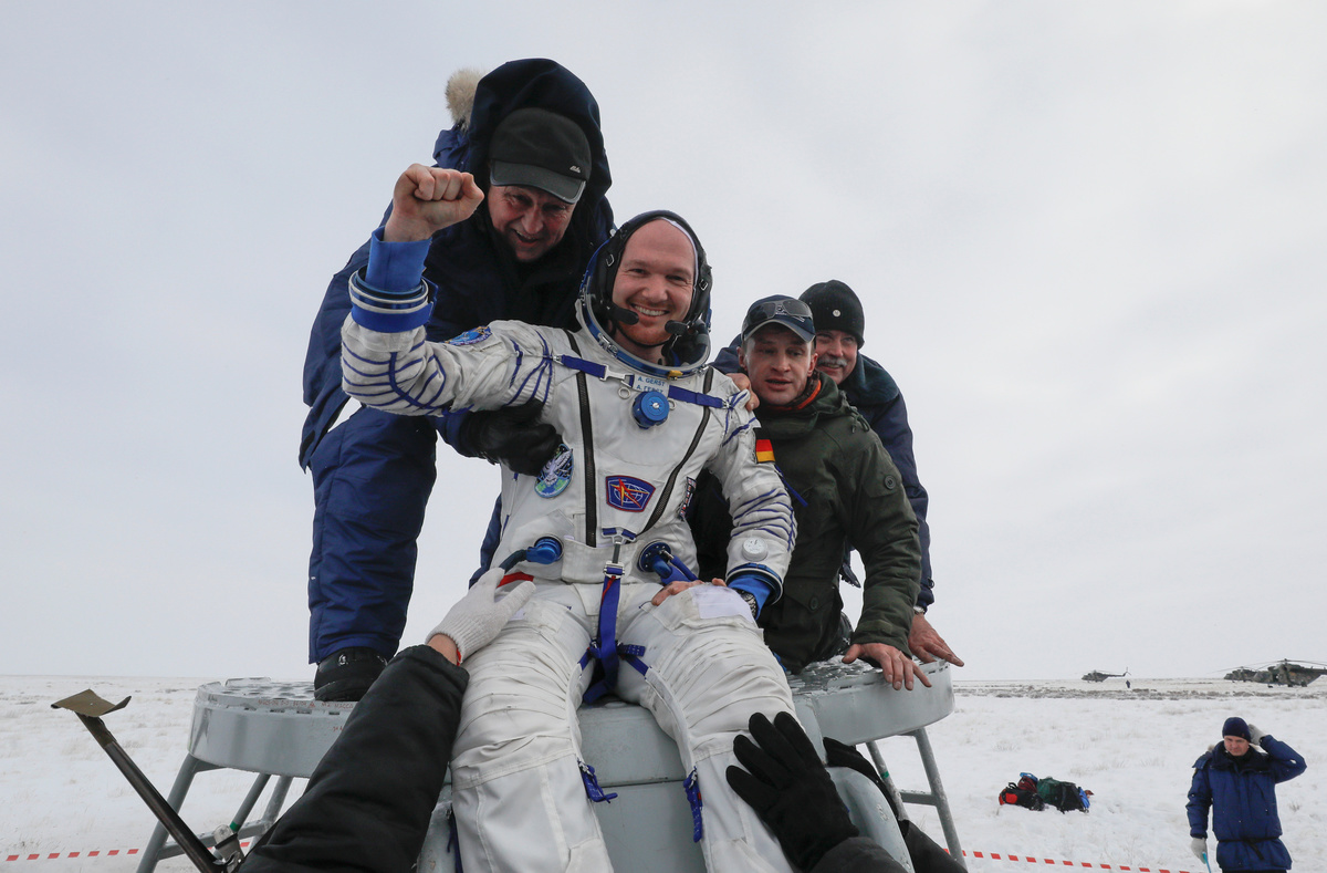 Ground personnel help International Space Station (ISS) crew member Alexander Gerst of Germany to get out of the Soyuz MS-09 capsule after landing in a remote area near the town of Zhezkazgan, formerly known as Dzhezkazgan, Kazakhstan December 20, 2018. REUTERS/Shamil Zhumatov