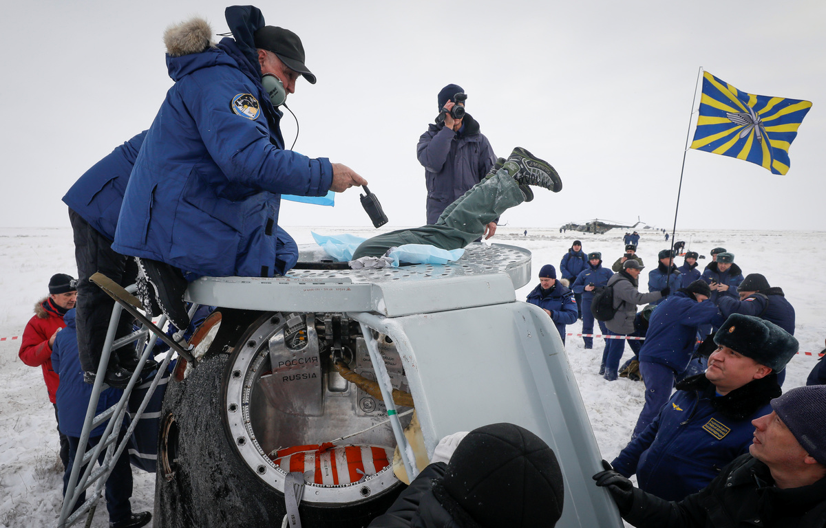 Ground personnel help International Space Station (ISS) crew member Sergey Prokopyev of Russia to get out of the Soyuz MS-09 capsule after landing in a remote area near the town of Zhezkazgan, formerly known as Dzhezkazgan, Kazakhstan December 20, 2018. REUTERS/Shamil Zhumatov