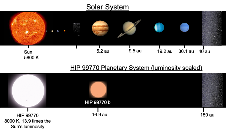 What the HIP99770 system does offer is an analogy to our own Solar System. It has a cold “debris disk” of ice and rock far out from the star, akin to a scaled-up version of the Kuiper Belt in our Solar System.