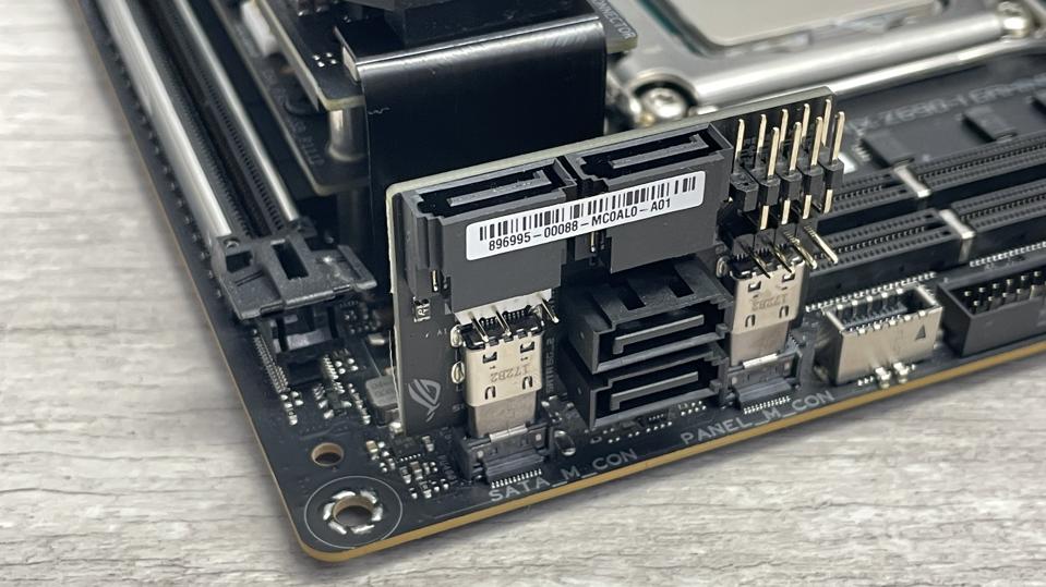 A vertical riser card is included that saves space on the main PCB by housing the four SATA ports, two RGB headers and the front panel connector. However, if you'd prefer to not use the card then you can power on your PC using a 2-pin connector on the PCB, albeit with no power and hard disk activity lights or reset switch.