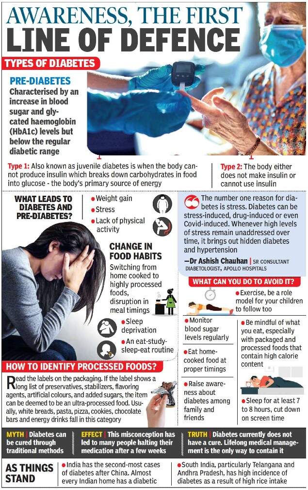 “In the last one and a half year with restricted physical activity and same amount of calorie intake leading to drastic weight gain, we are seeing many people who come for regular check-ups and have a chance discovery of diabetes,” said K Sunitha Premalatha, chief dietician, Yashoda hospitals. She gave an example of chance discovery of pre-diabetes in a 23-year-old who came with leg swelling on Thursday. The boy’s mother too was detected to be diabetic during the check-up.