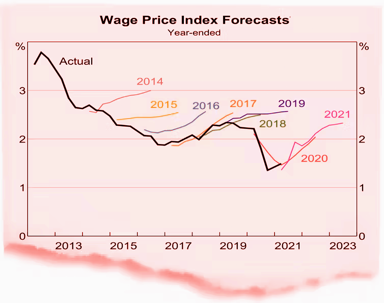The Bank is forecasting annual wages growth of 3% by December and 3.5% by December 2023, but it concedes its wage growth forecasts have been overoptimistic in the past, producing higher numbers than eventuated in most of the past ten years.