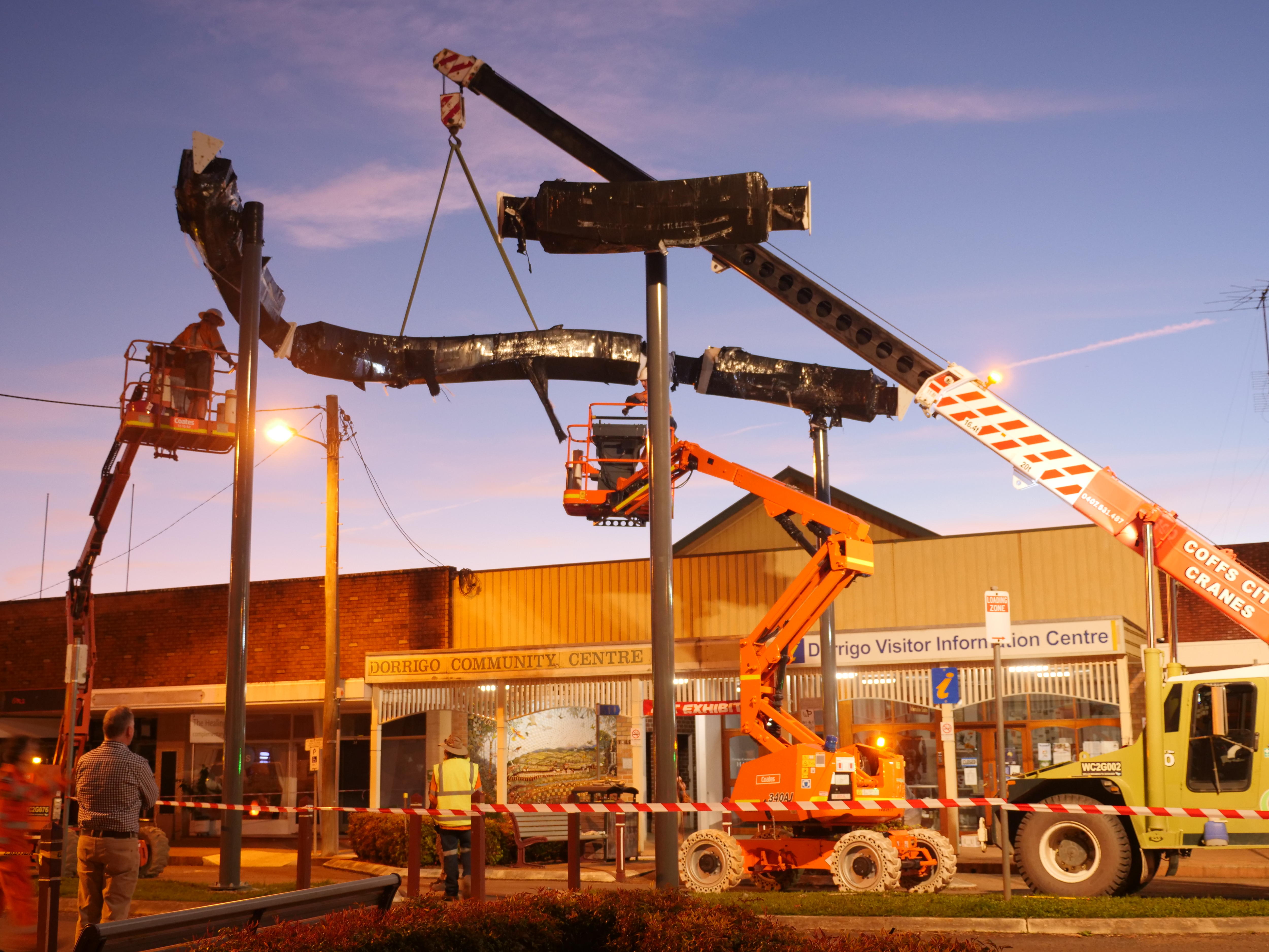 The controversial Water Cloud sculpture has been installed in the main street of the NSW Mid North Coast town after more than eight years of planning.