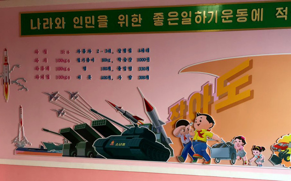One wall poster illustrated a patriotic fable about a humble porcupine overcoming a fearsome tiger _ a not-so-subtle allegory for North Korea's view of its relationship with the U.S. Another showed a cartoon of joyous-looking children next to an intercontinental ballistic missile launch. In the kitchen, a cook told us that Kim Jong Un, the country's current top leader, once visited the school.