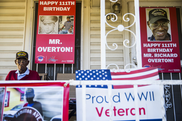 They also keep track of his visitors, because people stop by all the time at the house on Richard Overton Avenue. That's right. On his 111th birthday on May 11, the town renamed his street. Some 200 people came out for the party on his front lawn, lining up to take a photo with Overton like kids waiting to meet Santa Claus.