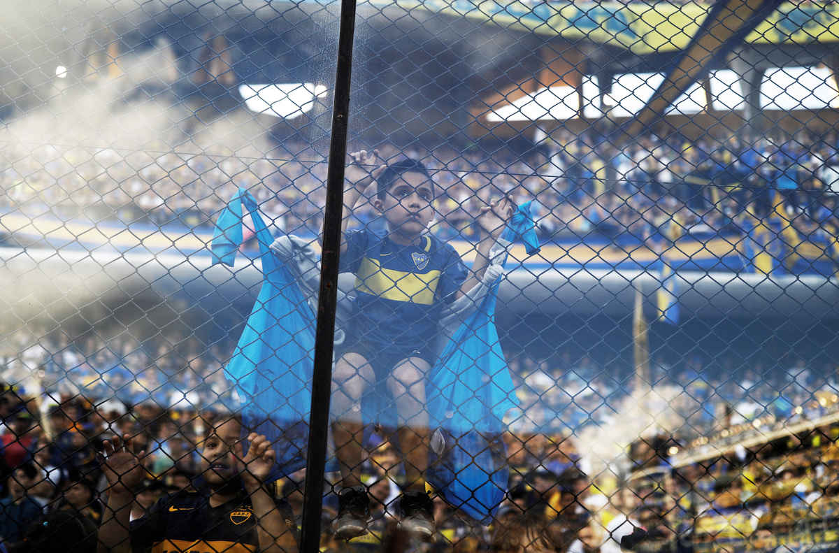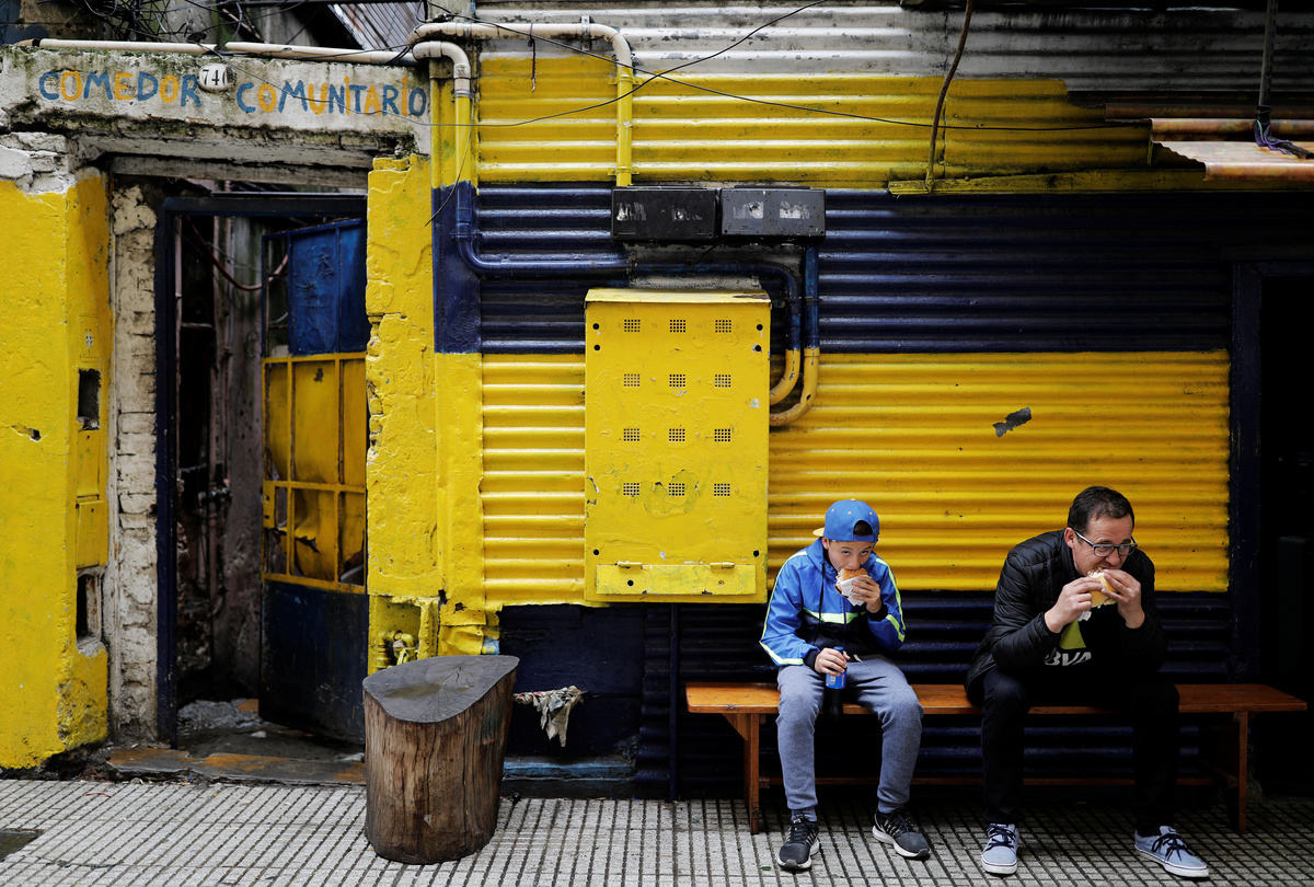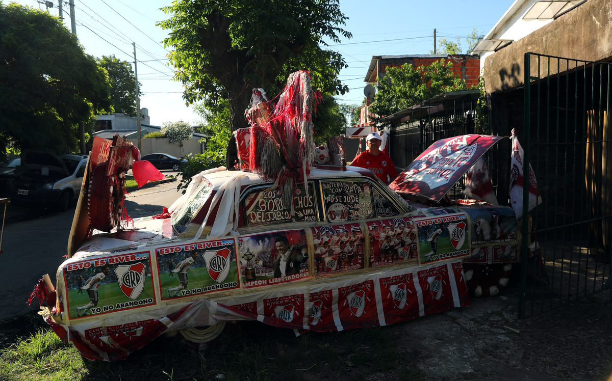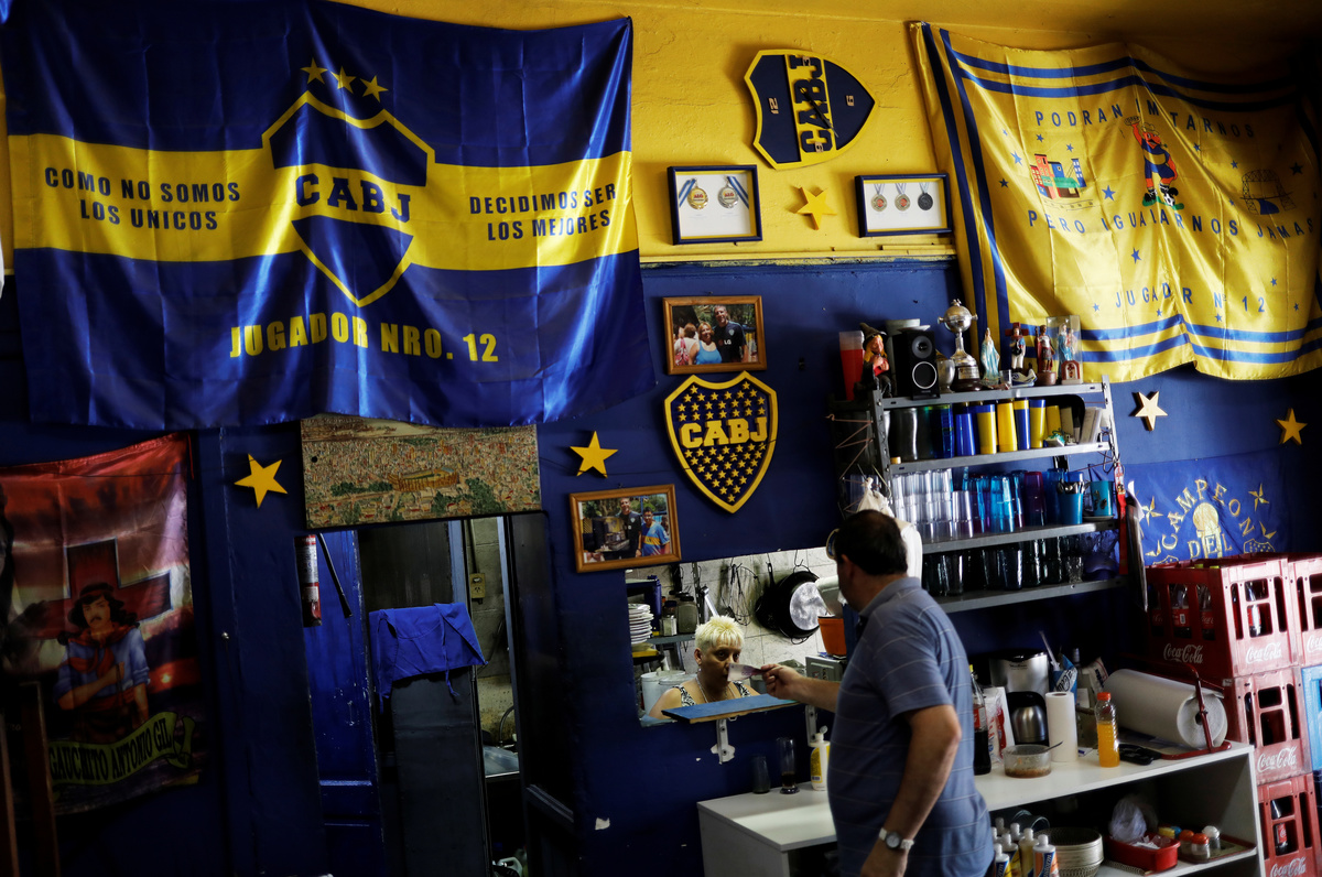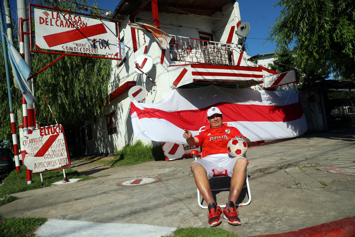A young soccer fan of Boca Junior sits on a t-shirt his father hung on the safety fencing, to watch the match between Boca Juniors and Patronato, ahead of the second leg of the final of the Copa Libertadores between local rivals Boca Juniors and River Plate in Buenos Aires, Argentina, November 17, 2018. REUTERS/Nacho DoceRiver Plate fans take selfies outside the Monumental stadium in Buenos Aires, Argentina, November 17, 2018. For the first time in Copa Libertadores's 58-year history Argentina's two biggest clubs, Boca Juniors and River Plate, are meeting in the final. REUTERS/Marcos Brindicci A soccer fan pays Silvia, 58, the owner of Matias Parrilla, who cooks for soccer fans of Boca Juniors next to La Bombonera stadium in the La Boca neighbourhood, ahead of the second leg of the final of the Copa Libertadores between local rivals Boca Juniors and River Plate in Buenos Aires, Argentina, November 15, 2018. REUTERS/Nacho Doce A Ford Falcon car decorated with the colours of soccer team River Plate is seen outside the home of River Plate fan Miguel Aguirre in Lanus, Argentina, November 20, 2018. For the first time in Copa Libertadores's 58-year history Argentina's two biggest clubs, Boca Juniors and River Plate, are meeting in the final. REUTERS/Marcos Brindicci River Plate fan Vicente Zucala, speaks during an interview with Reuters at his home in Escobar, Argentina, November 17, 2018. "This is a very important match, we cannot lose," said Zucala, a 29-year old blind fan of River Plate. "If we lose, we're done, it will all be over." For the first time in Copa Libertadores's 58-year history Argentina's two biggest clubs, Boca Juniors and River Plate, are meeting in the final. REUTERS/Marcos Brindicci Virulaso, 60, a former soccer hooligan and a fan of Boca Juniors, wears the team's t-shirt and cap as he sits inside his home in the La Boca neighbourhood, ahead of the second leg of the final of the Copa Libertadores between local rivals Boca Juniors and River Plate in Buenos Aires, Argentina, November 14, 2018. REUTERS/Nacho Doce A cat sits underneath a poster of Boca Juniors team from the year 1998/99 inside Ribera Sur bar in the La Boca neighbourhood, ahead of the second leg of the final of the Copa Libertadores between local rivals Boca Juniors and River Plate in Buenos Aires, Argentina, November 14, 2018. REUTERS/Nacho Doce An image of Argentine soccer star Diego Maradona is seen on a timber sheet inside a Coventillo in the La Boca neighbourhood, ahead of the second leg of the final of the Copa Libertadores between local rivals Boca Juniors and River Plate in Buenos Aires, Argentina, November 14, 2018. REUTERS/Nacho Doce River Plate fans cheer as they wait for the River Plate team bus to leave River Plate's Monumental stadium for the Copa Libertadores first leg final match in Buenos Aires, Argentina, November 10, 2018. For the first time in Copa Libertadores's 58-year history Argentina's two biggest clubs, Boca Juniors and River Plate, are meeting in the final. REUTERS/Marcos Brindicci SEARCH "BRINDICCI DOCE" FOR THIS STORY. SEARCH "WIDER IMAGE" FOR ALL STORIES.Residents drink beer amongst Boca Juniors memorabilia inside Ribera Sur bar in the La Boca neighbourhood, ahead of the second leg of the final of the Copa Libertadores between local rivals Boca Juniors and River Plate in Buenos Aires, Argentina, November 13, 2018. REUTERS/Nacho Doce Soccer fans of Boca Juniors climb the fence as they cheer for their team before the first leg of the final of the Copa Libertadores between local rivals Boca Juniors and River Plate in Buenos Aires, Argentina, November 11, 2018. REUTERS/Nacho Doce La Bombonera stadium is seen in the La Boca neighbourhood, ahead of the second leg of the final of the Copa Libertadores between local rivals Boca Juniors and River Plate in Buenos Aires, Argentina, November 16, 2018. REUTERS/Nacho Doce Soccer fans of Boca Juniors eat meat on a street in the La Boca neighbourhood, before the match between Boca Juniors and Patronato, ahead of the second leg final of the Copa Libertadores between local rivals Boca Juniors and River Plate in Buenos Aires, Argentina, November 17, 2018. REUTERS/Nacho Doce