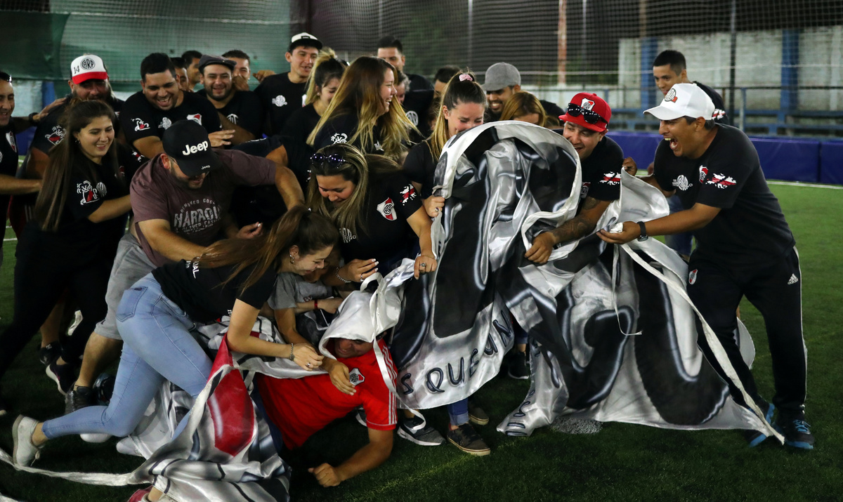 Members of the Ituzaingo official River Plate supporters club fall over their leader Mauro Lezama as they gather at a club in Merlo, Argentina, November 19, 2018. For the first time in Copa Libertadores's 58-year history Argentina's two biggest clubs, Boca Juniors and River Plate, are meeting in the final. REUTERS/Marcos Brindicci