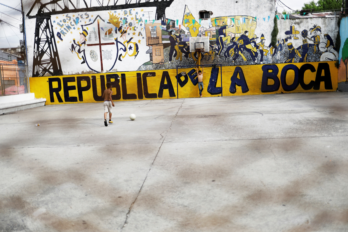 Residents play soccer in the La Boca neighbourhood, ahead of the second leg of the final of the Copa Libertadores between local rivals Boca Juniors and River Plate in Buenos Aires, Argentina, November 13, 2018. The writing reads "Republic of Boca". REUTERS/Nacho Doce