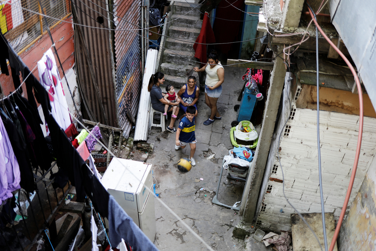 Ticiano, 6, wears a t-shirt of Boca Juniors team as he plays in front of his mother Belen, 24, holding her baby, grandmother Carmen, 59, and his aunt at the entrance of their house, inside a Coventillo in the La Boca neighbourhood, ahead of the second leg of the final of the Copa Libertadores between local rivals Boca Juniors and River Plate in Buenos Aires, Argentina, November 15, 2018. REUTERS/Nacho Doce