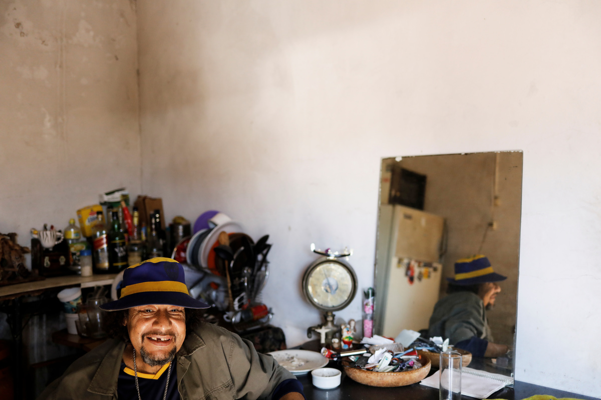 Miguel Aguirre sits outside his home which is covered with the colours of River Plate, during an interview with Reuters in Lanus, Argentina, November 20, 2018. For the first time in Copa Libertadores's 58-year history Argentina's two biggest clubs, Boca Juniors and River Plate, are meeting in the final. REUTERS/Marcos Brindicci