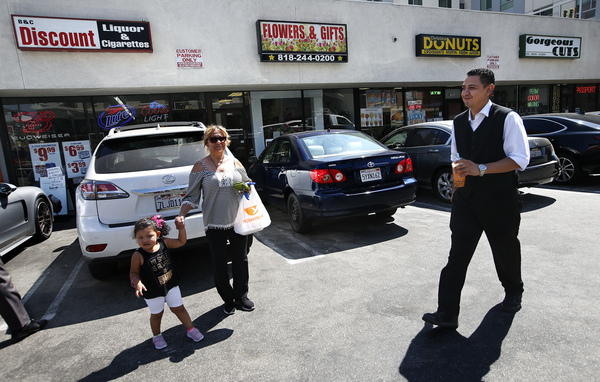 People with money come to the Americana to relax, shop, eat and watch the big fountain dance. Mendiola takes his breaks at Christina Donuts, in a little strip mall across Colorado Boulevard.