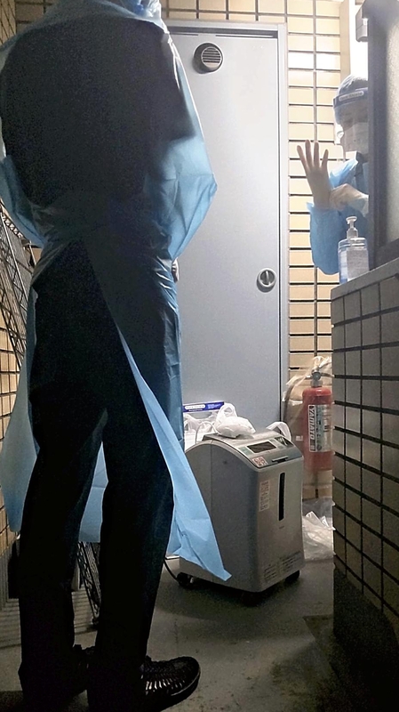 Arriving at the home of the Setagaya Ward patient, the two personnel hastily put on semitransparent protective clothing for infectious diseases in front of the entrance. They then took a ventilator inside.