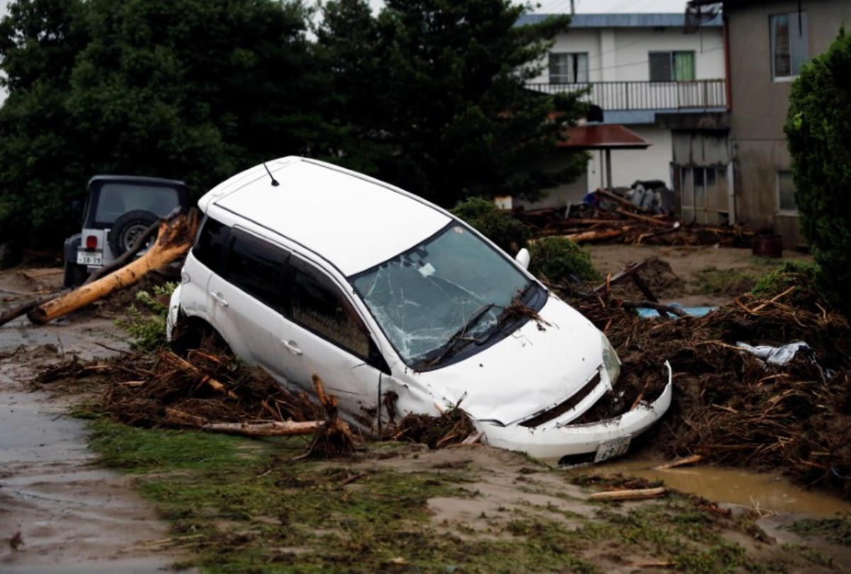 A car damaged by a swollen river is seen after heavy rain hit the area in Asakura, Fukuoka Prefecture. REUTERS/Issei Kato