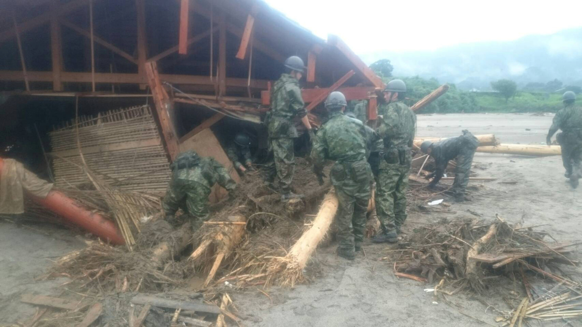 Japan Self-Defense Force (JSDF) soldiers conduct rescue operations after heavy rain hit the area in Asakura, Fukuoka Prefecture. Defense Ministry of Japan/Handout via REUTERS