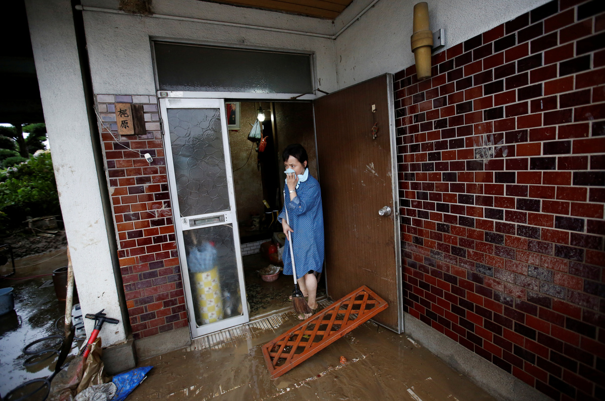A local resident reacts as she cleans her house damaged by heavy rain in Asakura, Fukuoka Prefecture. REUTERS/Issei Kato