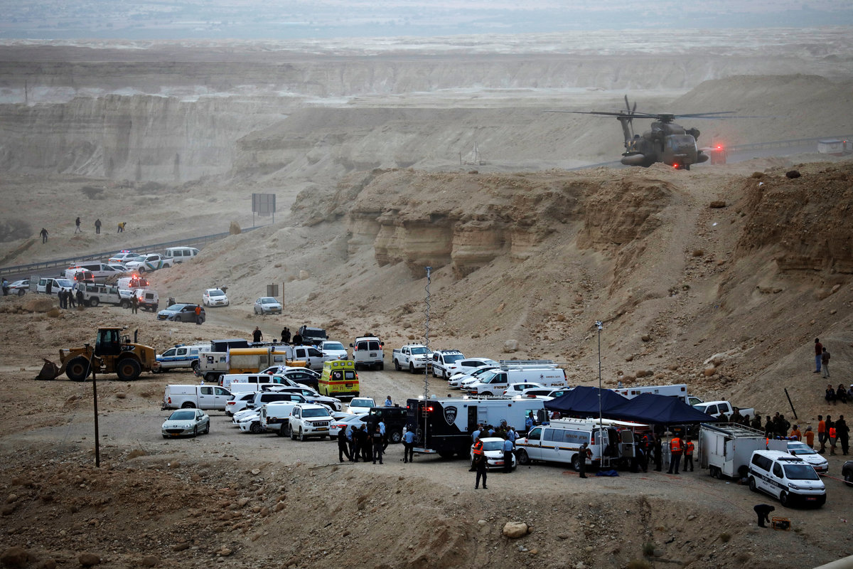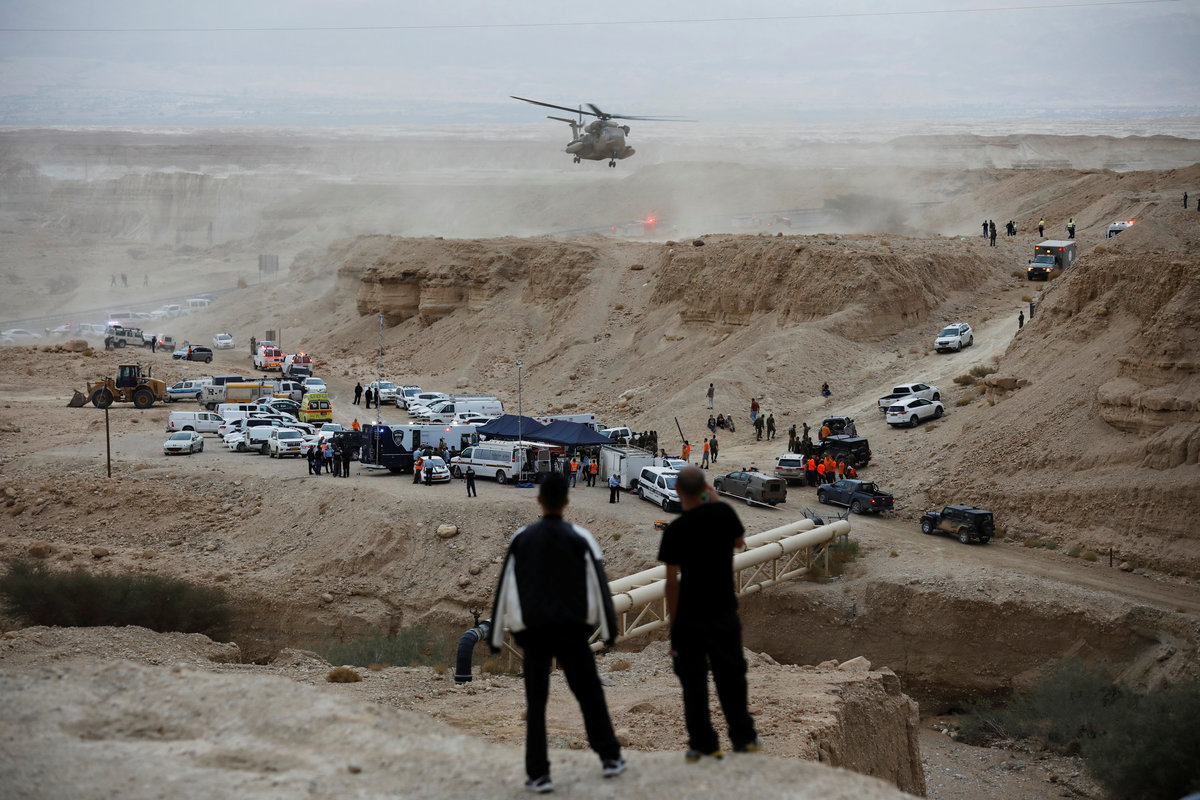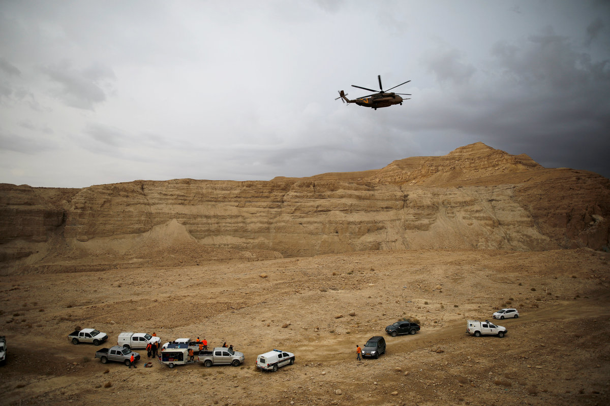 A helicopter operates near the site where a group of Israeli youths was swept away by a flash flood, near the Zafit river bed, south to the Dead Sea, Israel, April 26, 2018. REUTERS/Amir CohenIsraeli rescue services personnel operate near the site where a group of Israeli youths was swept away by a flash flood, near the Zafit river bed, south to the Dead Sea, Israel, April 26, 2018. REUTERS/Amir CohenA helicopter operates near the site where a group of Israeli youths was swept away by a flash flood, near the Zafit river bed, south to the Dead Sea, Israel, April 26, 2018. REUTERS/Amir CohenIsraeli rescue services personnel operate near the site where a group of Israeli youths was swept away by a flash flood, near the Zafit river bed, south to the Dead Sea, Israel, April 26, 2018. REUTERS/Amir CohenA helicopter operates near the site where a group of Israeli youths was swept away by a flash flood, near the Zafit river bed, south to the Dead Sea, Israel, April 26, 2018. REUTERS/Amir Cohen