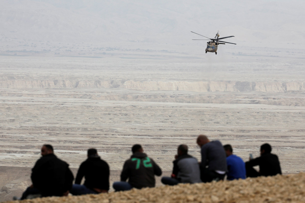 People look on as Israeli rescue services helicopter operates near the site where a group of Israeli youths was swept away by a flash flood, near the Zafit river bed, south to the Dead Sea, Israel, April 26, 2018. REUTERS/Amir Cohen