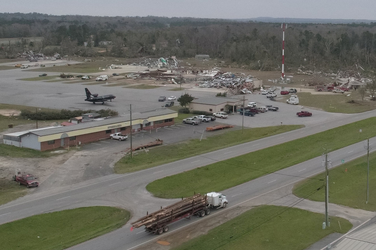 Debris lies on the grounds of Weedon Field, the Eufaula Municipal Airport, and alongside U.S. Route 431 after one of two destructive tornadoes passed through Lee County the previous afternoon, in an aerial photograph taken in Eufaula, Alabama, U.S. March 4, 2019. REUTERS/Dronebase