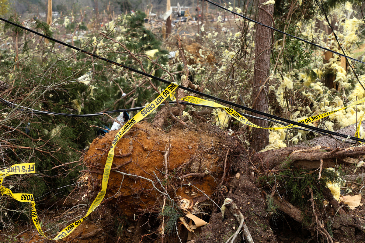 Police tape is seen across uprooted tree roots after two deadly back-to-back tornadoes, in Beauregard, Alabama, U.S., March 4, 2019. REUTERS/Elijah Nouvelage
