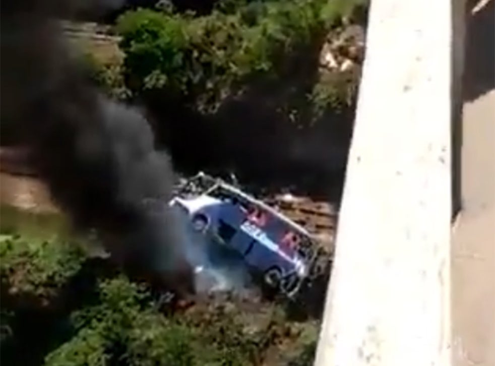 The bus was travelling on an overpass by the city of Joao Monlevade when a collision with a tractor-trailer sent it careering off the side of the road, before plunging 45 feet and landing on train tracks.