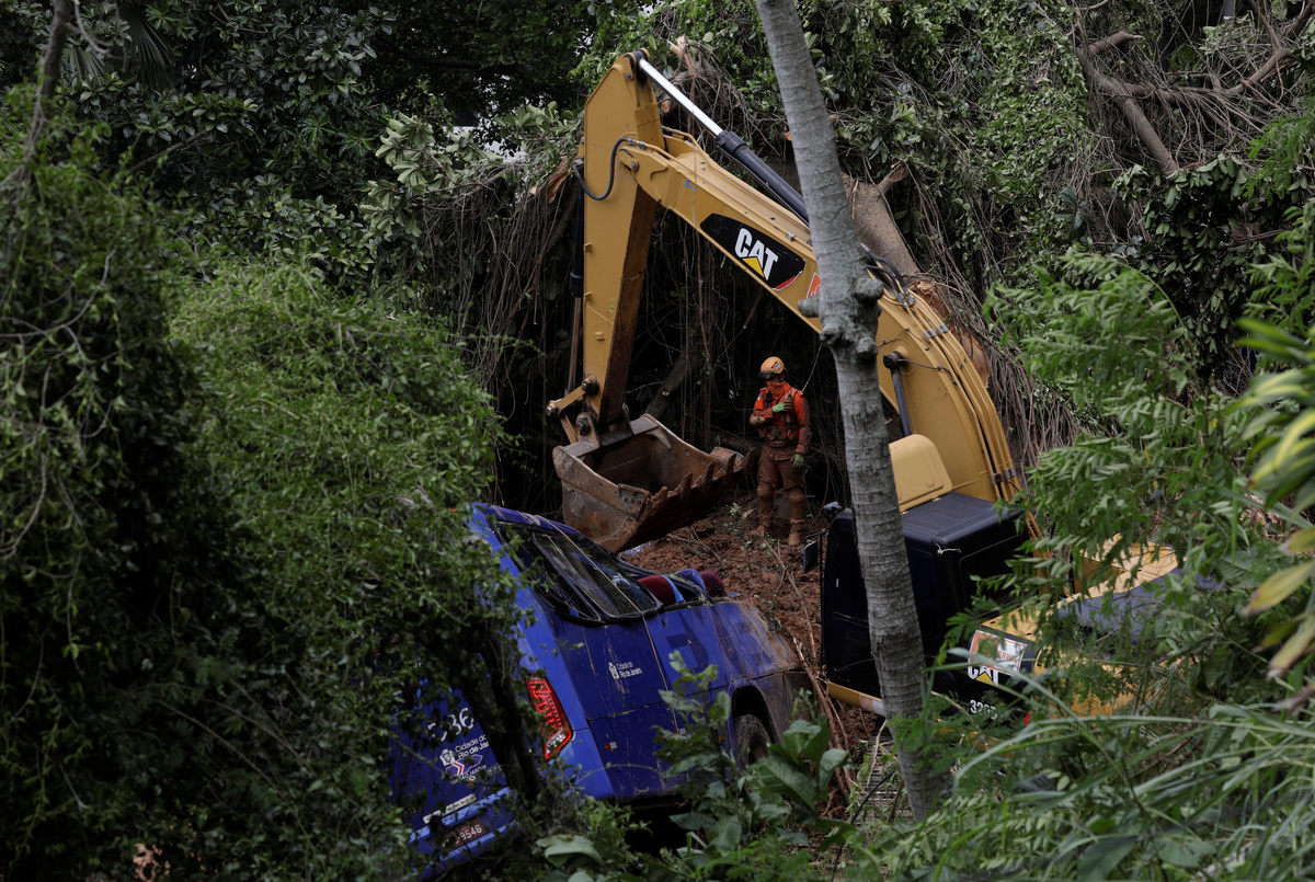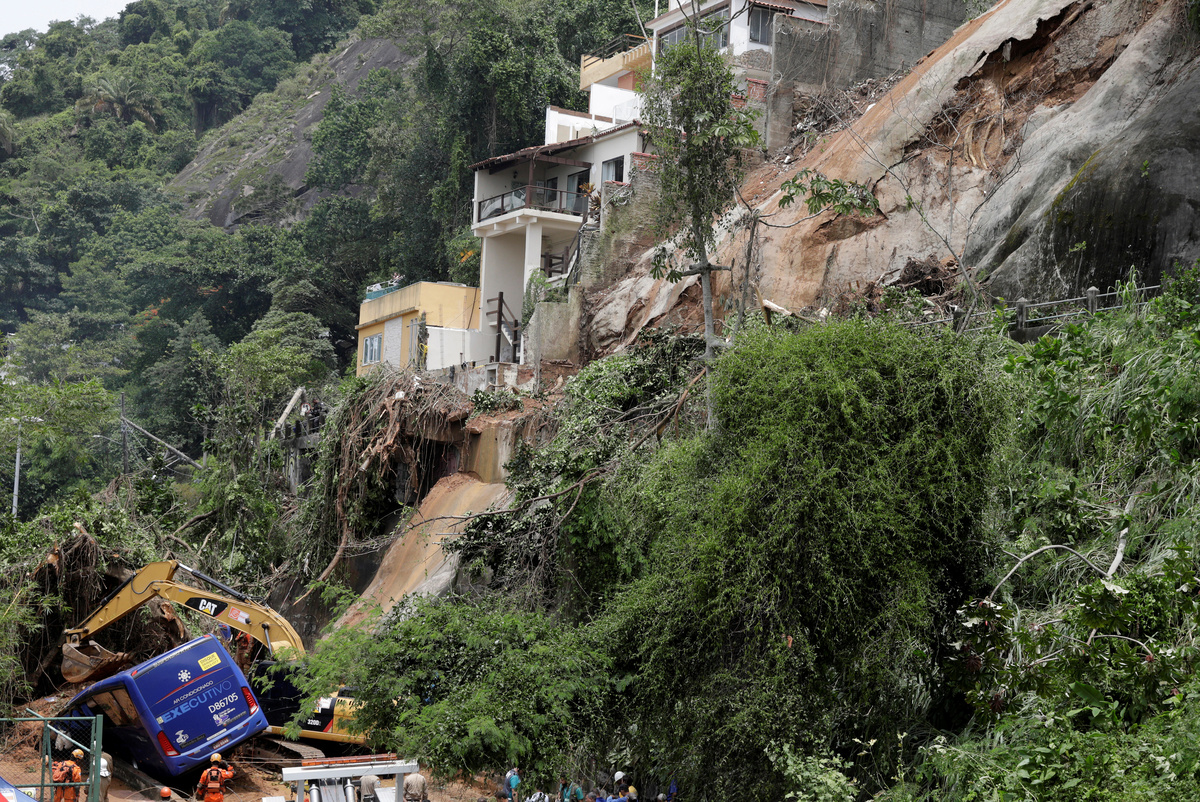 Firefighters search for victims inside a damaged bus, which was hit by a mudslide after heavy rains in Rio de Janeiro, Brazil, February 7, 2019. REUTERS/Ricardo Moraes