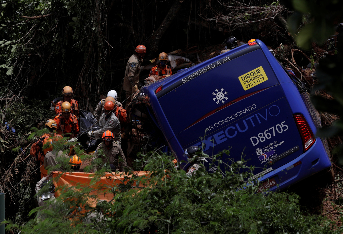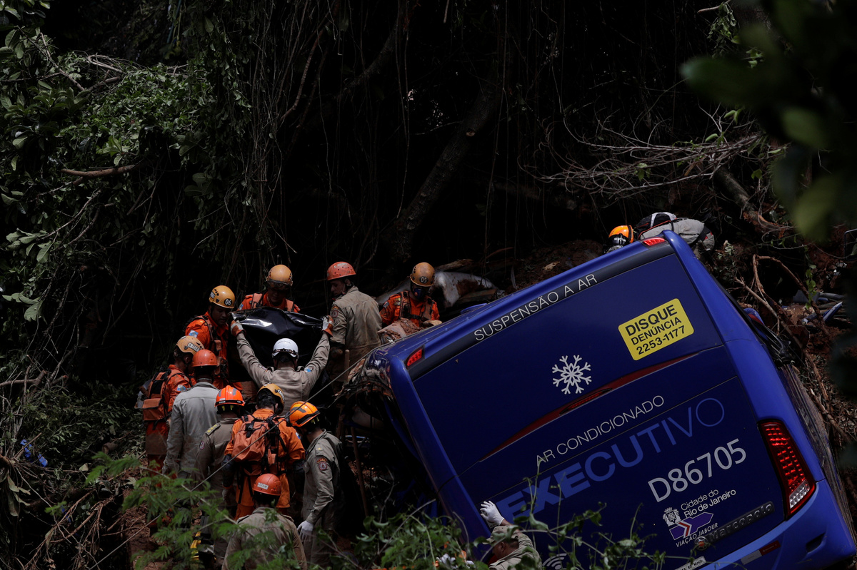 Firefighters remove the body of a victim from a damaged bus, which was hit by a mudslide after heavy rains in Rio de Janeiro, Brazil, February 7, 2019. REUTERS/Ricardo Moraes