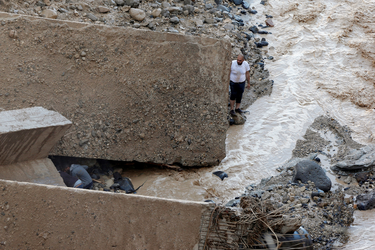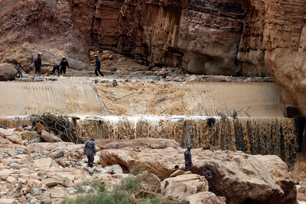 A general view of the location where rain storms unleashed flash floods, near the Dead Sea, Jordan October 26, 2018. REUTERS/Muhammad HamedCivil defense members look for survivors after rain storms unleashed flash floods, near the Dead Sea, Jordan October 26, 2018. REUTERS/Muhammad HamedA member of the civil defense stands near an ambulance as they search for survivors after rain storms unleashed flash floods, near the Dead Sea, Jordan October 26, 2018. REUTERS/Muhammad HamedA civil defense member looks forsurvivors after rain storms unleashed flash floods, near the Dead Sea, Jordan October 26, 2018. REUTERS/Muhammad HamedCivil defense members gather to find survivors after rain storms unleashed flash floods, near the Dead Sea, Jordan October 26, 2018. REUTERS/Muhammad HamedA civil defense member walks as people gather to find survivors after rain storms unleashed flash floods, near the Dead Sea, Jordan October 26, 2018. REUTERS/Muhammad HamedA general view shows the location of the accident where rain storms unleashed flash floods, near the Dead Sea, Jordan October 26, 2018. REUTERS/Muhammad HamedA man looks for survivors after rain storms unleashed flash floods, near the Dead Sea, Jordan October 26, 2018. REUTERS/Muhammad HamedA general view show the location of the accident where people, mainly schoolchildren and teachers, were killed on Thursday in a flash flood near the Dead Sea, Jordan October 25, 2018. REUTERS/Muhammad HamedA general view show the location of the accident where people, mainly schoolchildren and teachers, were killed on Thursday in a flash flood near the Dead Sea, Jordan October 25, 2018. REUTERS/Muhammad HamedRelatives gather outside a hospital near the Dead Sea, Jordan October 25, 2018. REUTERS/Muhammad HamedA child survivor is seen with relatives in a hospital near the Dead Sea, Jordan October 25, 2018. REUTERS/Muhammad HamedA child survivor is helped as residents and relatives gather outside a hospital near the Dead Sea, Jordan October 25, 2018. REUTERS/Muhammad HamedA child survivor is helped as residents and relatives gather outside a hospital near the Dead Sea, Jordan October 25, 2018. REUTERS/Muhammad HamedCivil defense members look to find survivors after rain storms unleashed flash floods, near the Dead Sea, Jordan October 26, 2018. REUTERS/Muhammad HamedCivil defense members look for survivors after rain storms unleashed flash floods, near the Dead Sea, Jordan October 26, 2018. REUTERS/Muhammad Hamed